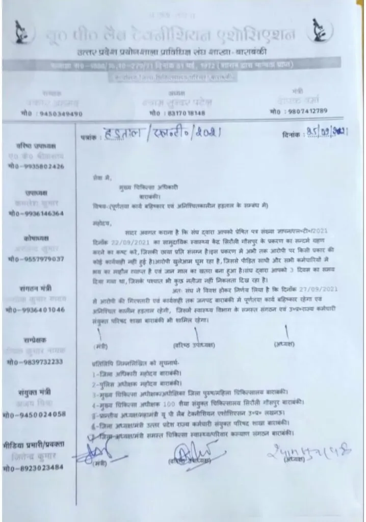 बाराबंकी। सामुदायिक स्वास्थ्य केंद्र सिरौलीगौसपुर में विगत 21 सितंबर को लैब टेक्नीशियन से हुई मारपीट एवं गालीगलौज प्रकरण में 22 सितंबर को यूपी लैब टेक्नीशियन एशोशिएसन शाखा बाराबंकी द्वारा मुख्य चिकित्साधिकारी को ज्ञापन सौंपा गया था। जिसकी प्रतिलिपि जिलाधिकारी एवं पुलिस अधीक्षक को दी गई थी। प्रतिनिधि मंडल द्वारा मौखिक वार्ता भी की गई थी।