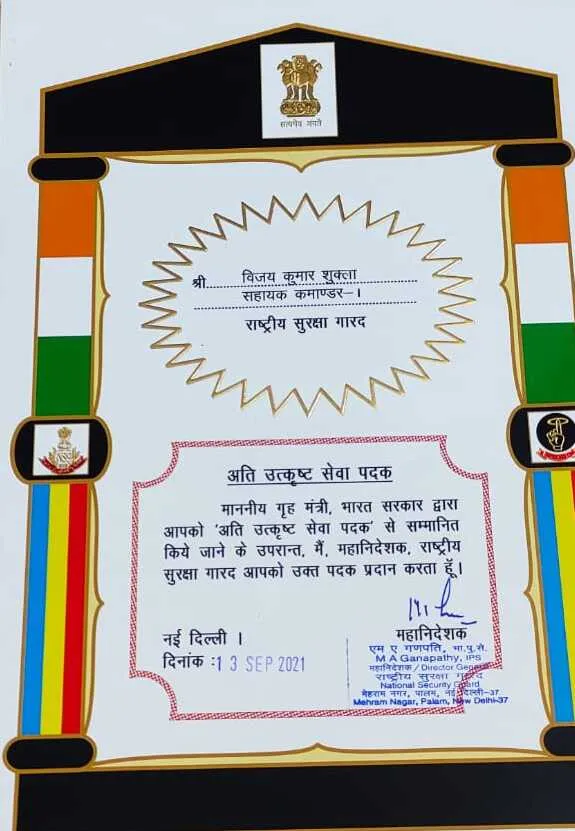 अमेठी। राष्ट्रीय सुरक्षा गारद में कार्यरत विजय कुमार शुक्ल सहायक कमांडर को माननीय गृह मंत्री भारत सरकार ने अति उत्कृष्ट सेवा पदक से सम्मानित किया है। ग्रामसभा बदलापुर के मेंहदा गांव के निवासी विजय कुमार शुक्ल, डॉ राम बहादुर शुक्ल के द्वितीय पुत्र हैं । विजय कुमार शुक्ल बचपन से ही कुशाग्र बुद्धि व देशभक्ति के गुण से परिपूर्ण थे। वर्तमान में वह राष्ट्रीय सुरक्षा गारद गुरु ग्राम नई दिल्ली में सहायक कमांडर के पद पर कार्यरत हैं। यह पदक सुरक्षा गारद (NSG) के महानिदेशक द्वारा दिया गया।