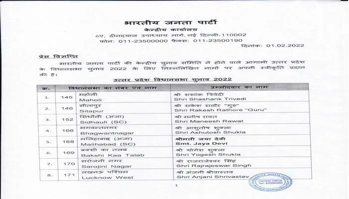लखनऊ। यूपी चुनाव सिर पर हैं ऐसे में विभिन्न पार्टियां धुरंधरों को चुनावी मैदान में उतार रही हैं। इसी कड़ी में बीजेपी ने चौथे चरण के चुनाव के लिए 17 उम्मीदवारों की नई लिस्ट जारी कर दी है। लखनऊ कैंड से बीजेपी ने बृजेश पाठक को टिकट दिया है। सरोजनीनगर के मंत्री स्वाति सिंह का टिकट कट गया है।