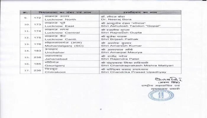 सरोजनीनगर से ईडी के पूर्व डायरेक्टर राजेश्वर सिंह को टिकट दिया गया है। वहीं लखनऊ मध्य से रजनीश गुप्ता को उम्मीदवार बनाया गया है। वहीं लखनऊ पश्चिम से अंजली श्रीवास्तव को चुनावी मैदान में उतारा गया है। वहीं लखनऊ पूर्व से गोपाल टंडन को बीजेपी ने उम्मीदवार बनाया है।