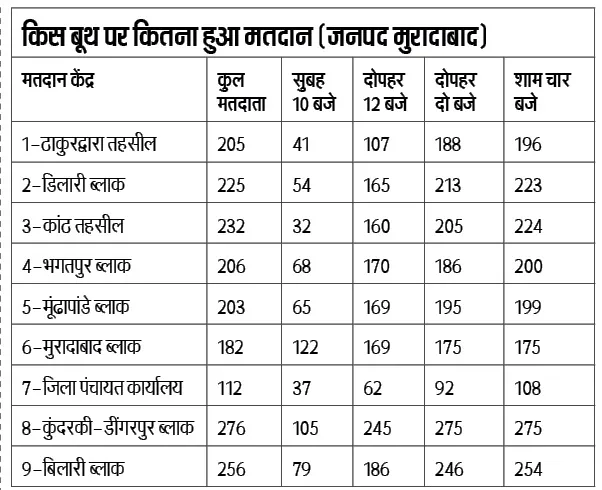 मुरादाबाद-बिजनौर सीट के लिए शनिवार को जिले के नौ बूथों पर मतदान हुआ। सभी बूथों के बाहर भाजपा व सपा के शिविर लगे हुए थे। जिसमें भाजपा व सपा नेता अपने समर्थकों के साथ बैठे नजर आये। लेकिन हर बूथ पर सबसे ज्यादा भीड़ भारतीय जनता पार्टी के लोगों की दिखाई दी। जबकि समाजवादी पार्टी के शिविर में सिर्फ दो चार पदाधिकारी भी बैठे दिखाई दिए। इसके अलावा भाजपा व सपा प्रत्याशी जिले के सभी बूथों पर शाम चार बजे तक घूमते रहे।