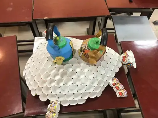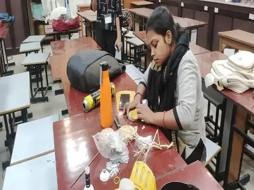 छात्रा ने बटन और पिन से पिकासो की पेंटिंग तैयार की है, तो वहीं दूसरी छात्रा ने लोहे के चेन और बर्तन से मल्टी परपज वाल लैंप बनाया है। इसके साथ ही प्लास्टिक, लोहे और लकड़ियों की कटाई-छंटाई भी खुद स्टूडेंट ही कर रहे हैं।