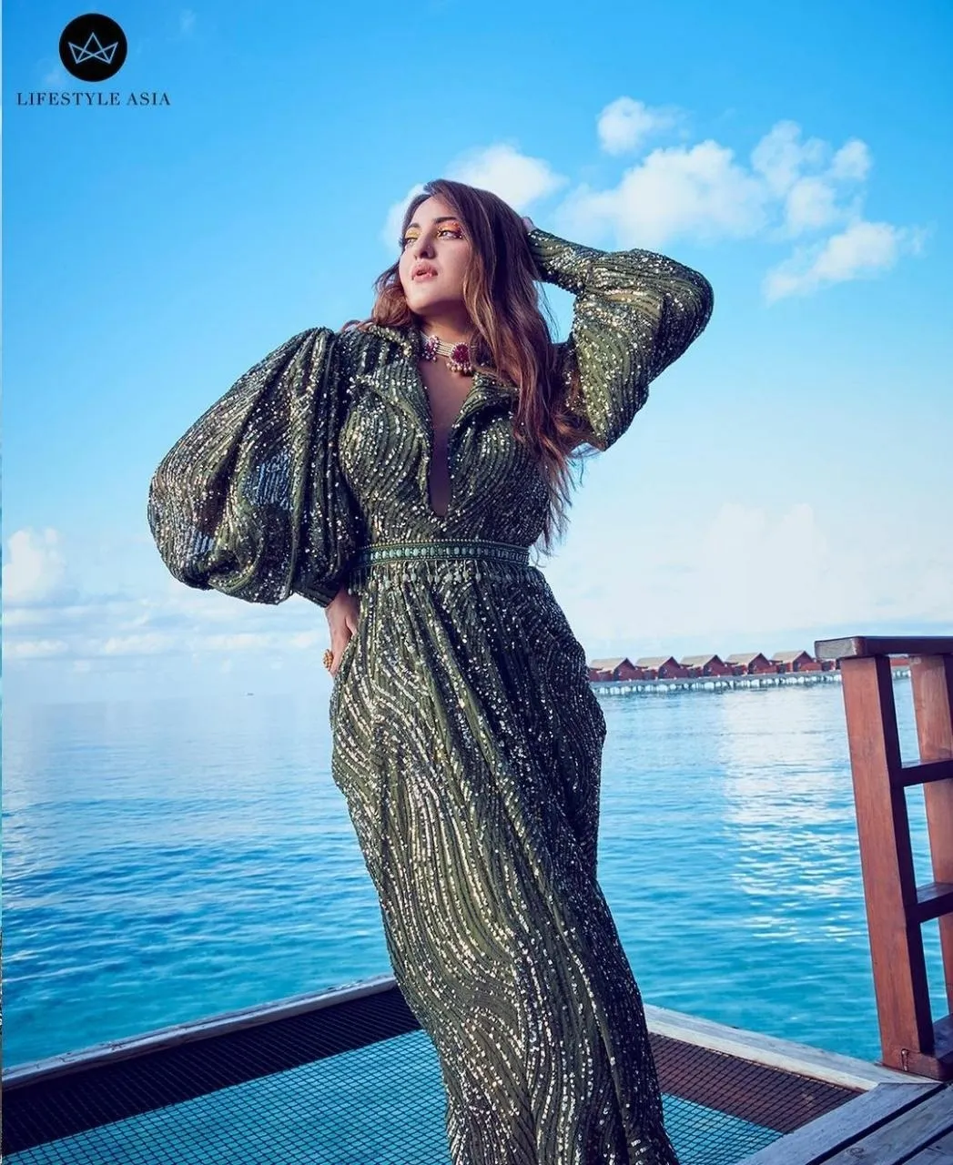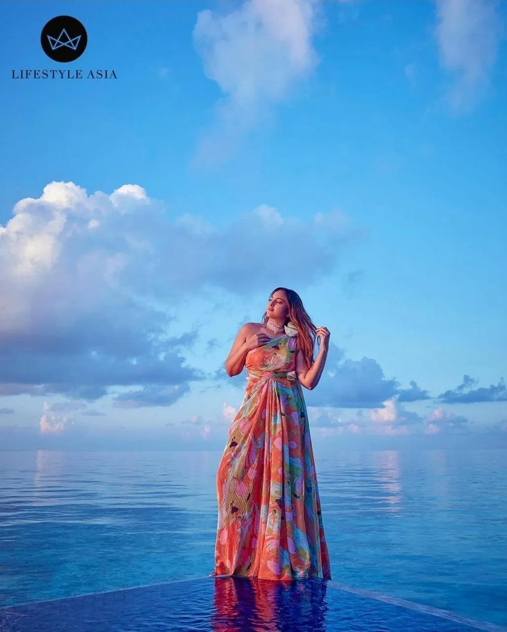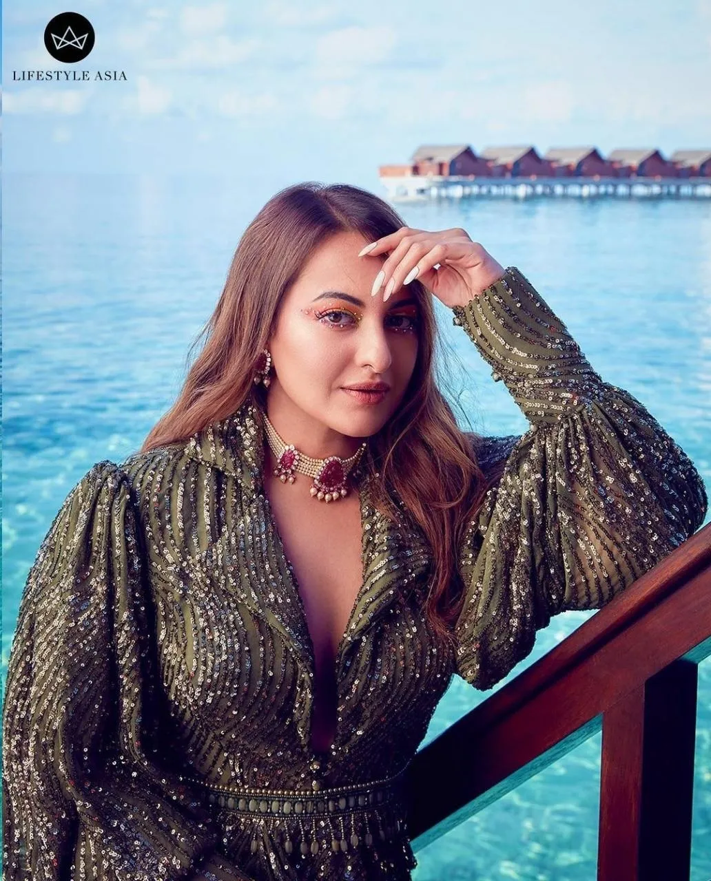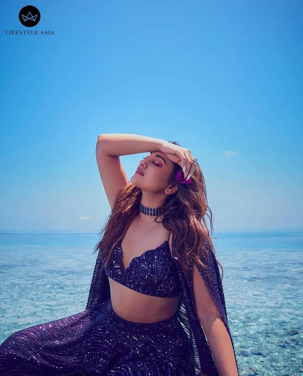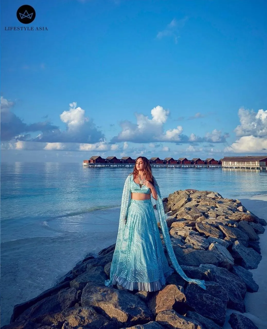 सोनाक्षी ने ये फोटोशूट मालदीव के खूबसूरत समंदर के तट पर करवाया है। स्काई ब्लू कलर के लहंगे में उनका लुक बेहद प्यारा दिख रहा है। जिसे उन्होने कर्ली बालों के साथ ही भारी भरकम मोतियों के नेकपीस के साथ मैच किया है।