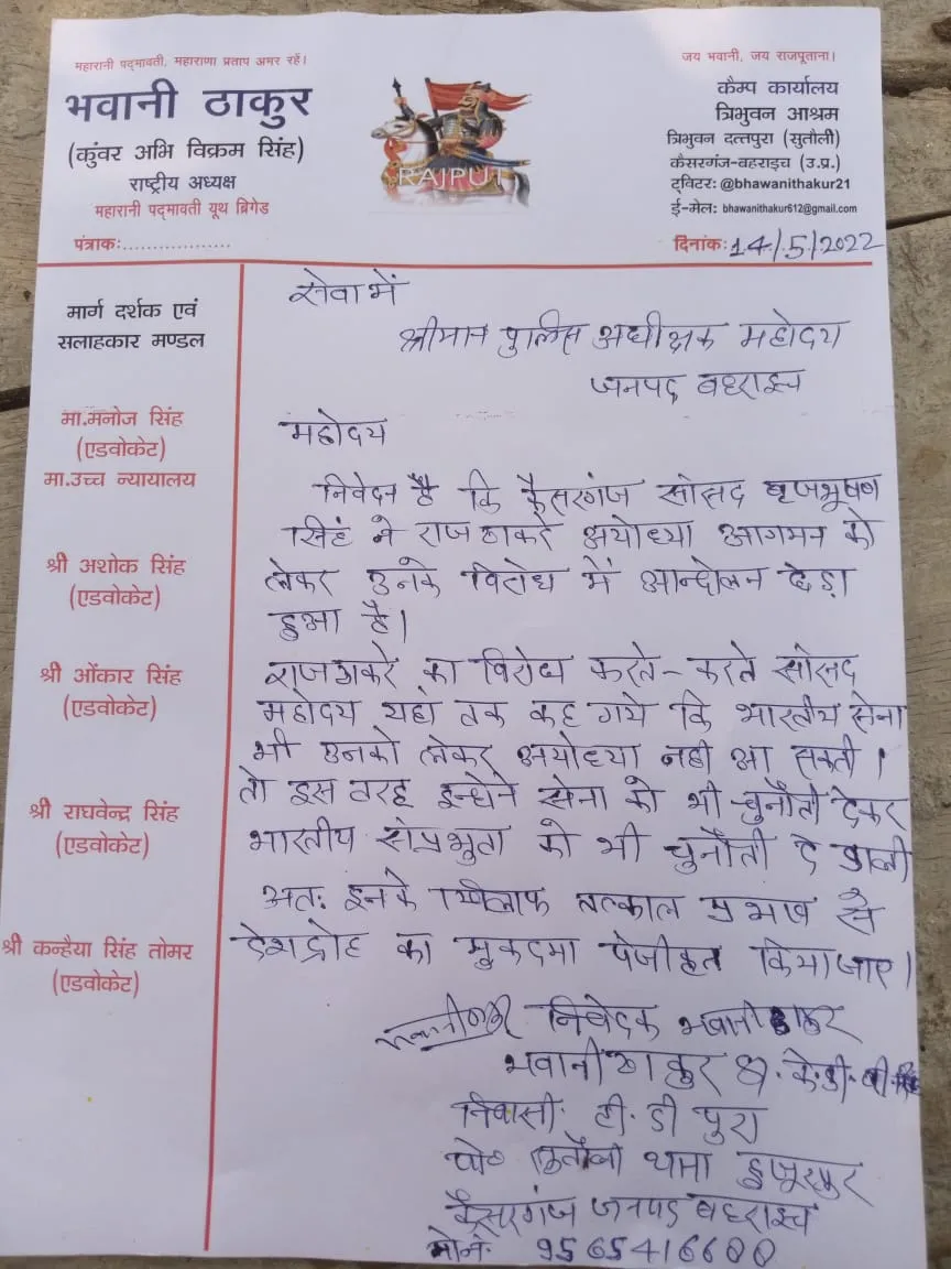 शनिवार को एक कार्यक्रम के दौरान सांसद ने कहा कि पांच जून को राज ठाकरे को सेना भी अयोध्या नहीं ला सकती। सांसद ने सेना को भी खुली चुनौती दे दी। इसको देखते हुए महारानी पद्मावती यूथ ब्रिगेड के राष्ट्रीय अध्यक्ष भवानी ठाकुर ने पुलिस अधीक्षक केशव कुमार चौधरी को शिकायती पत्र भेजा है। साथ ही सांसद के विरुद्ध राज द्रोह का मुकदमा दर्ज करने की मांग की है।