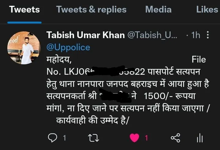 तबिश उमर खान ने बताया कि कागजात सत्यापन के लिए 1500 रूपये की मांग की गई। रूपया न देने पर कागजात सत्यापन भी न करने की बात कही गई। इस पर तबिश उमर खान ने उत्तर प्रदेश पुलिस को ट्वीट कर शिकायत कर दी।