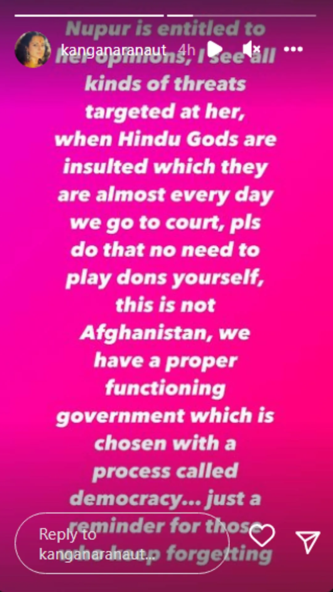 इसके आगे कंगना रनौत ने लिखा “यह अफगानिस्तान नहीं है। जो लोग भूल गए हैं उन्हें याद दिला दूं कि हमारे पास एक अच्छी सरकार है, जिसे लोकतांत्रिक व्यवस्था के द्वारा चुना गया है।’’ रनौत का बयान दिल्ली पुलिस द्वारा शर्मा और उनके परिवार को सुरक्षा प्रदान करने के कुछ घंटों बाद आया है। शर्मा ने कहा था कि उन्हें जान से मारने की धमकी मिल रही हैं।