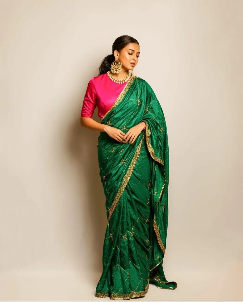 वहीं इस साड़ी की हेमलाइन पर भी मैचिंग गोल्डन गोटा पट्टी को ऐड किया गया है। हमेशा अपने मॉर्डन अंदाज में नजर आने वाली तेजस्वी प्रकाश इस साड़ी लुक में बला की खूबसूरत दिख रही हैं।
