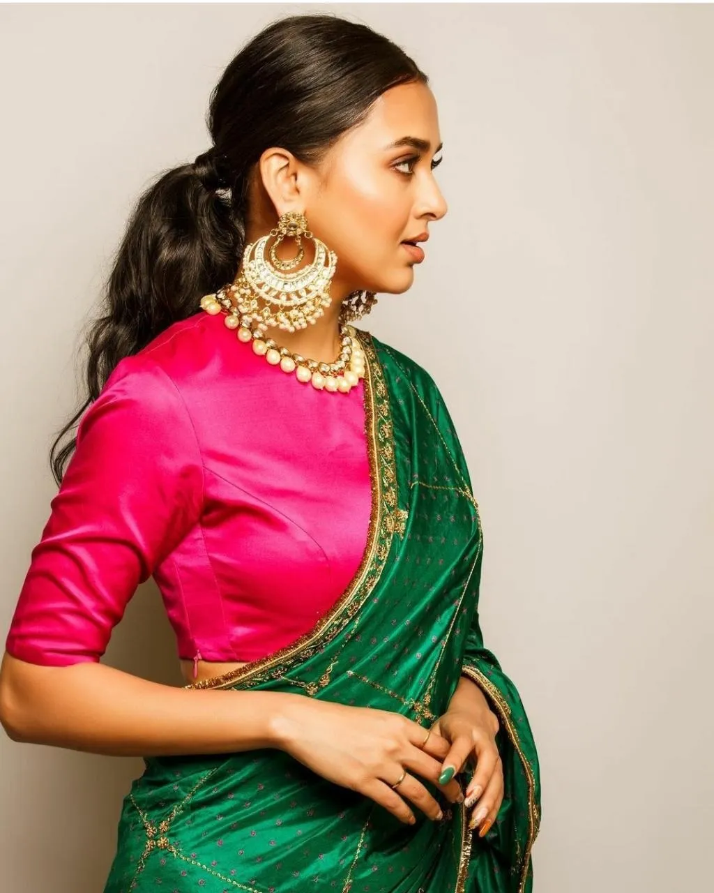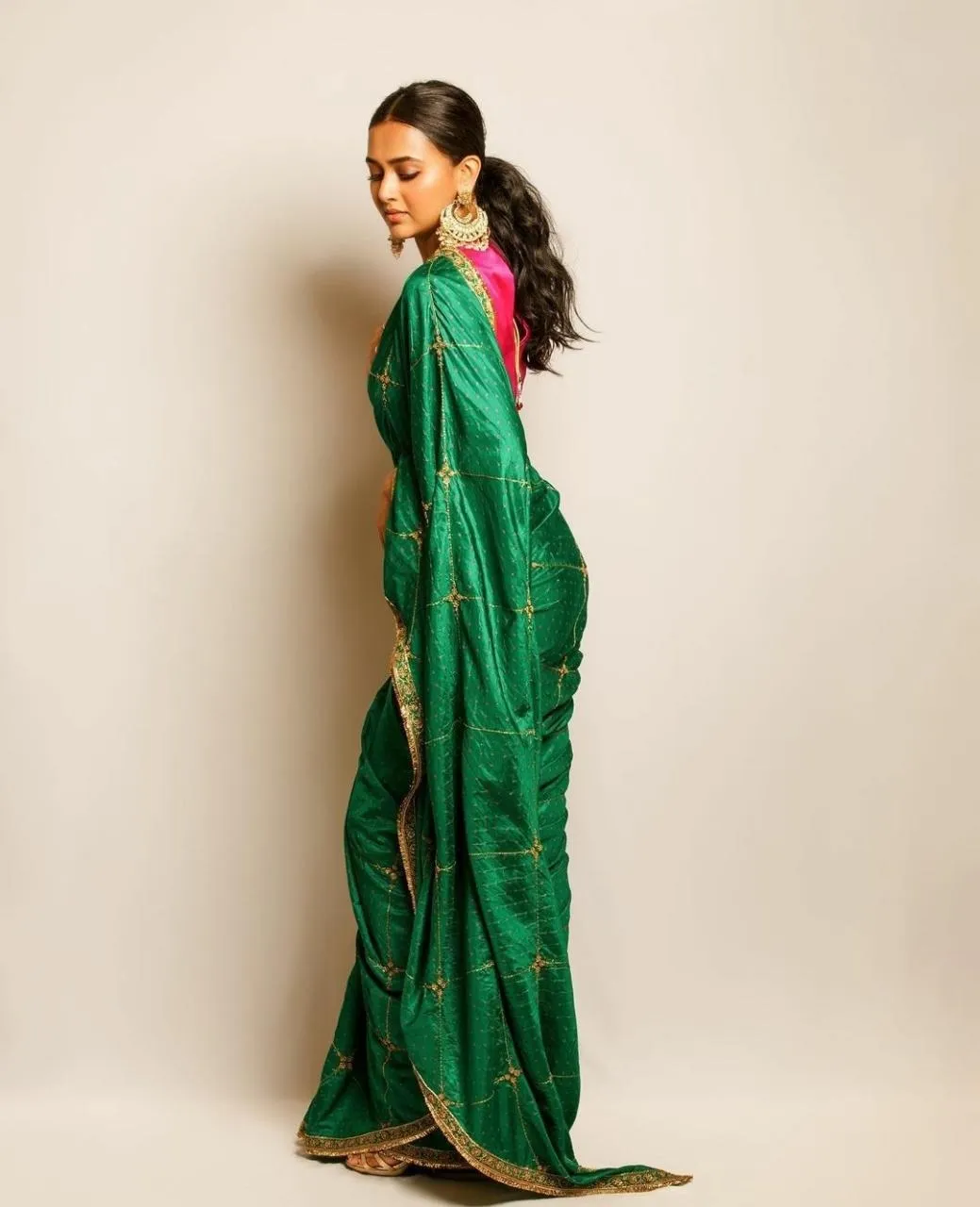 इन फोटोज में आप देख सकते हैं कि तेजस्वी ने पिंक प्लेन ब्लाउज पर ग्रीन साड़ी पहनी हुई है। साड़ी पर पिंक कलर के पोल्का डॉट प्रिंट भी बने हैं।