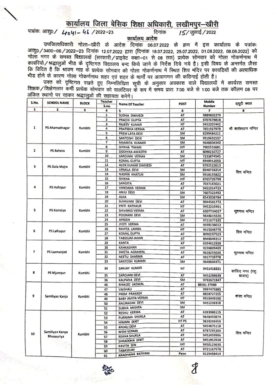 बीएसए डॉ. लक्ष्मीकांत पांडेय ने अपने जारी आदेश में कहा कि, सावन के महीने में सोमवार के दिन काफी तादाद में कांवड़ियों, श्रद्धालुओं की भीड़ गोला गोकर्णनाथ में होती है। इससे स्कूल आने-जाने में छात्रों को कठिनाइयों का सामना करना पड़ता है। साथ ही दुर्घटना की डर बना रहता है। इस लिए सभी प्राथमिक विद्यालय सावन महीने के हर सोमवार को बंद रहेंगे। वहीं सावन के हर सोमवार को स्कूलों में अवकाश और शिक्षकों के वालंटियर के रूप में कावंड़ियों की सेवा को लेकर बीएसए डॉ. लक्ष्मीकांत पांडेय के आदेश की कॉपी सोशल मीडिया पर खूब वायरल हो रही है।