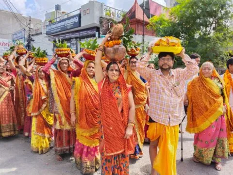 नवाबी रोड में कलश यात्रा निकालते श्रद्धालु।