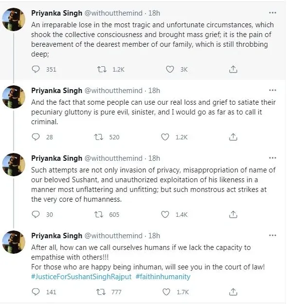 प्रियंका ने आगे लिखा- ऐसी हरकतें ना सिर्फ हमारी प्राइवेसी में दखल देती हैं बल्कि हमारे प्यारे सुशांत का नाम भी खराब करती हैं लेकिन कुछ लोग इस तरह के काम कर रहे हैं। आखिर हम कैसे खुद को इंसान कह सकते हैं जब दूसरों से सहानुभूति नहीं रख सकते हैं। उन लोगों के लिए जो अमानवीय होने से खुश हैं, आपको कोर्ट में देखेंगे।