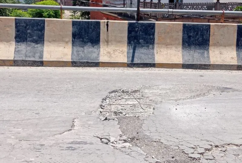 पुल की सड़क पर गढ्ढों से बाहर निकल आईं जाल की सरिया