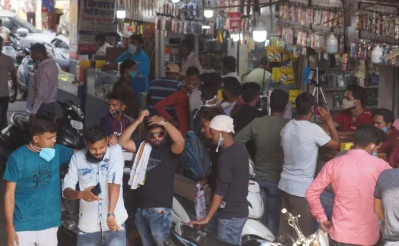 दुकानें खुलते ही भीड़ टूट पड़ी जिससे बाजार में जाम की स्थिति रही। ऑटो, हाथ ठेलों की रेलमपेल मची हुई थी। सोशल डिस्टेंसिंग कहीं नजर नहीं आ रही थी। लोगों को एक- दूसरे से सटकर आगे बढ़ना पड़ रहा था। तमाम लोग तो मास्क भी नहीं लगाए थे।