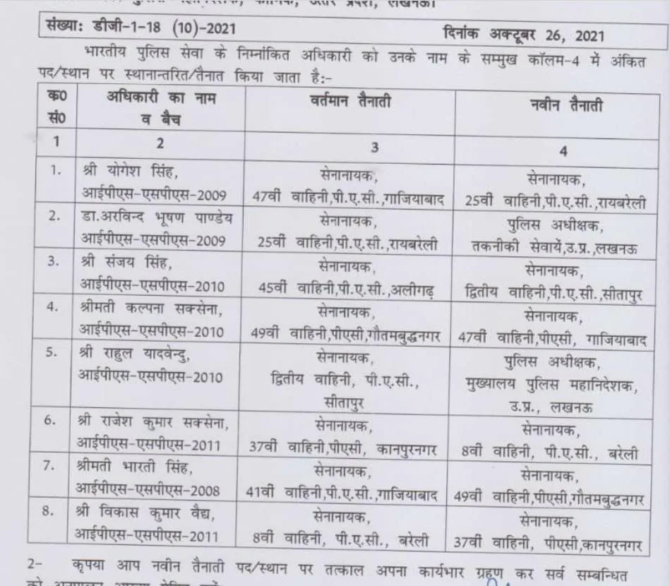 योगेश सिंह को सेनानायक 25वीं वाहिनी पीएसी रायबरेली बनाया गया है। अरविंद भूषण पांडेय को एसपी टेक्निकल सर्विसेस बनाया गया है। संजय सिंह को सेनानायक द्वितीय वाहिनी पीएसी सीतापुर भेजा गया है। गौतमबुद्ध नगर में तैनात कल्पना सक्सेना को सेनानायक 47वीं वाहिनी पीएसी गाज़ियाबाद बनाया गया है। राहुल यादवेन्दु को एसपी पुलिस मुख्यालय बनाया गया है।