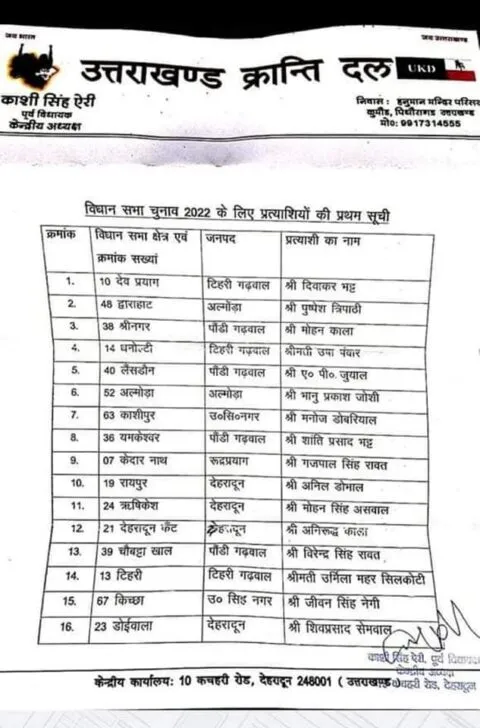 उत्तराखंड विधानसभा चुनाव 2022: यूकेडी ने जारी की 16 प्रत्याशियों की सूची, देखें लिस्ट