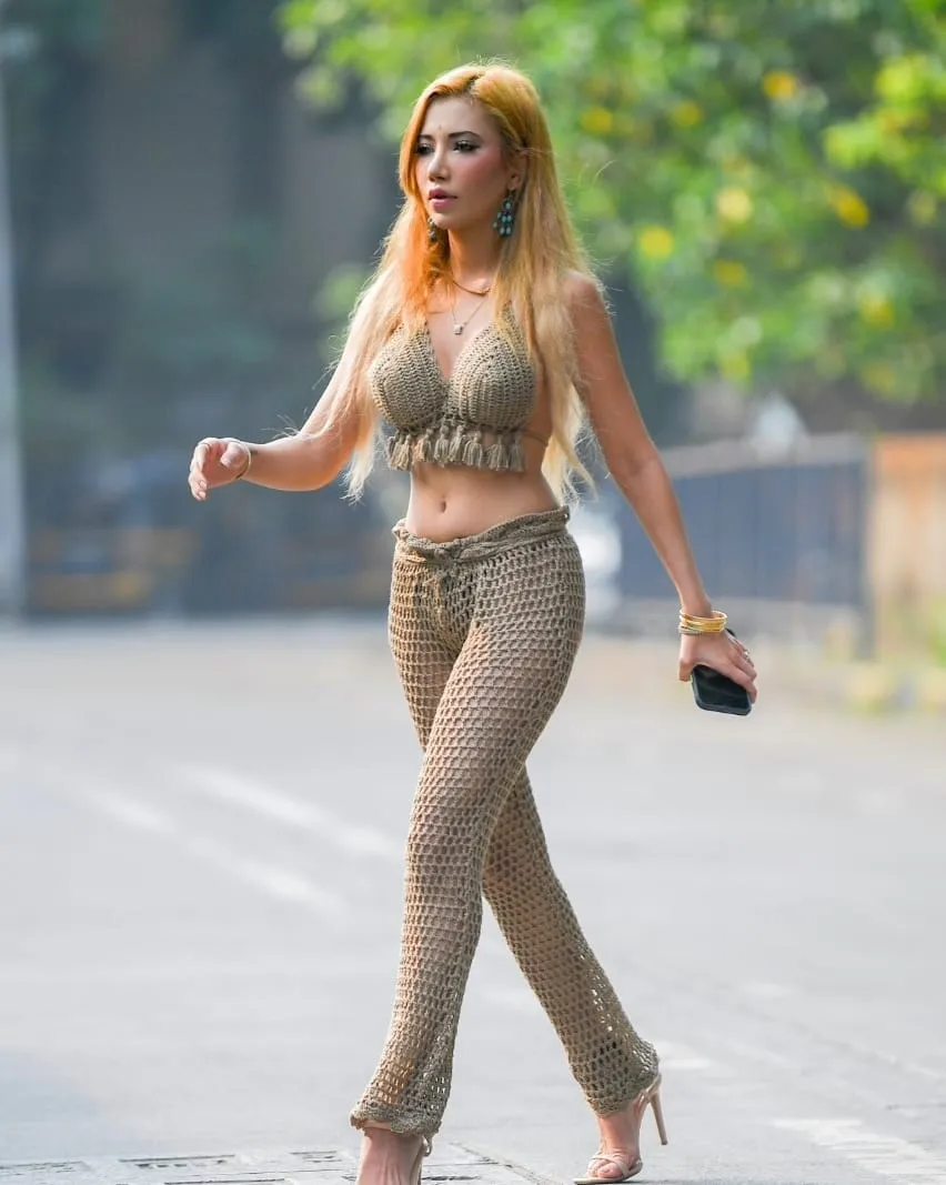 उनके इस लुक ने सभी का ध्यान अपनी तरफ घसीटा। साक्षी फिशनेट ट्रांसपेरेंट को-ऑर्ड सेट पहनी हुई थीं जिसमें एक हॉल्टर नेक टॉप और ट्राउजर था। साक्षी चोपड़ा ने कैमरे के सामने मुड़-मुड़कर पोज दिए, जिनमें उनकी हॉटनेस और निखर कर आ रही थी।