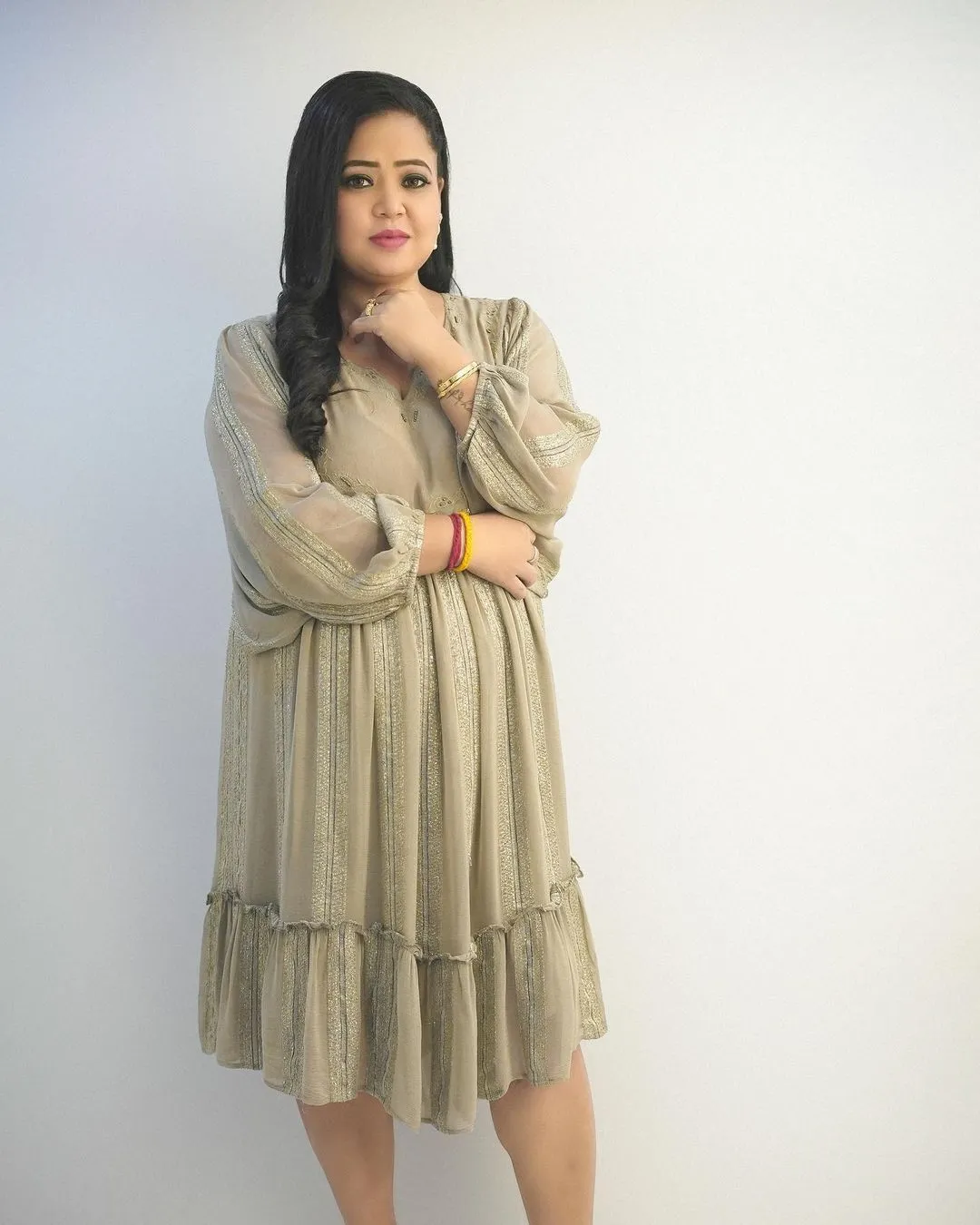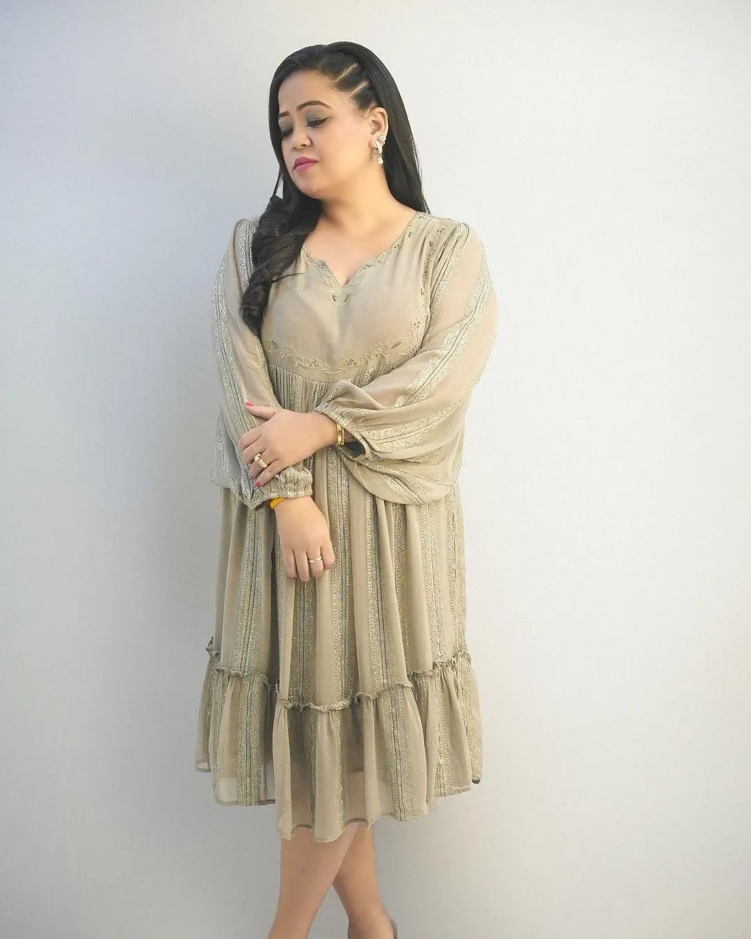 भारती इस फोटोशूट में लाइट कलर की ड्रेस पहनी हुई दिखाई दे रही हैं जिसमें वह काफी खूबसूरत लग रही हैं।