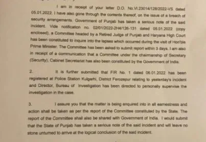 पंजाब सरकार द्वारा लिखे पत्र में कहा गया है कि पीएम मोदी की सुरक्षा में चूक का विषय गंभीर है। लेकिन इन सब बातों के बीच पंजाब सरकार ने किसी भी अधिकारी या किसी विभाग को न तो जिम्मेदार ठहराया है और न ही कोई कार्रवाई की है। आपको बता दें कि ये पत्र पंजाब के मुख्य सचिव ने भेजा है। जिसमें सिर्फ इतना कहा गया है कि जांच चल रही है। साथ ही यह भी बताया गया है कि पंजाब में पीएम मोदी का काफिला रोके जाने के मामले में पुलिस ने IPC की धारा 283 के तहत 150 अज्ञात लोगों के खिलाफ FIR दर्ज की है।
