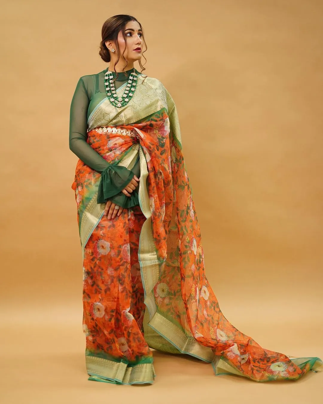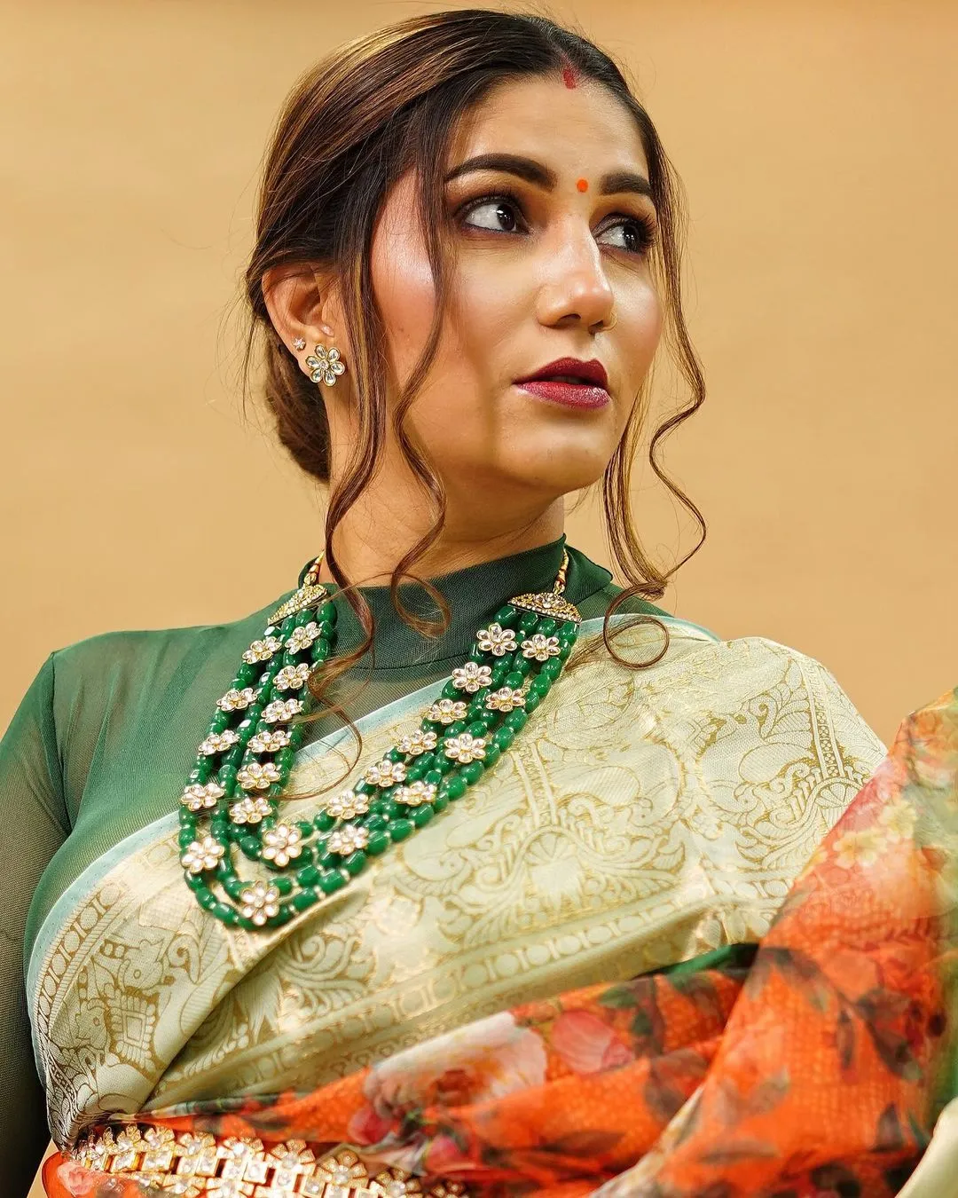 फुल स्लिव्स और फ्रिल वाले इस ब्लाउज में सपना काफी सिंदर लग रही हैं और गजब के पोज देती दिखाई दें रही हैं। डांसर ने लाइट साड़ी को हैवी नेकलेस के साथ पहना है। सभी फैंस सपना की फोटो पर जमकर कमेंट कर रहे हैं।