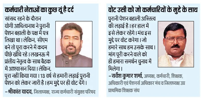प्रदेश में 16 लाख से अधिक कर्मचारी, शिक्षक व शिक्षामित्र विभिन्न विभागों में कार्यरत हैं। कर्मचारी संगठनों ने पुरानी पेंशन बहाली को लेकर लंबे समय से आंदोलन का बिगुल बजा रखा है। चुनाव से पहले तक प्रदेश व्यापी आंदोलन से कर्मचारी संगठन सरकार को ललकार रहे थे। आचार संहिता लगी तो उन्होंने सड़क पर उतरने के बजाय सोशल साइट्स पर आंदोलन को धार देना शुरू कर दिया। जिले में भी राज्य कर्मचारी, प्राथमिक व माध्यमिक शिक्षक अपने मुद्दे को गणतंत्र दिवस के दिन भी धार देते रहे। यह सरकार के लिए खतरे की घंटी साबित हो सकती है। पुरानी पेंशन बहाल न करने से सरकार से नाराज कर्मचारी-शिक्षक संगठनों को मरहम का भरोसा सपाध्यक्ष अखिलेश यादव दे चुके हैं। ऐसे में पेंशन की टेंशन सरकार के गले की हड्डी बनी हुई है। यदि कर्मचारी अपने मुद्दों को लेकर वोट डालने के समय अडिग रहे तो नया गुल खिलने से भी इनकार नहीं किया जा सकता।