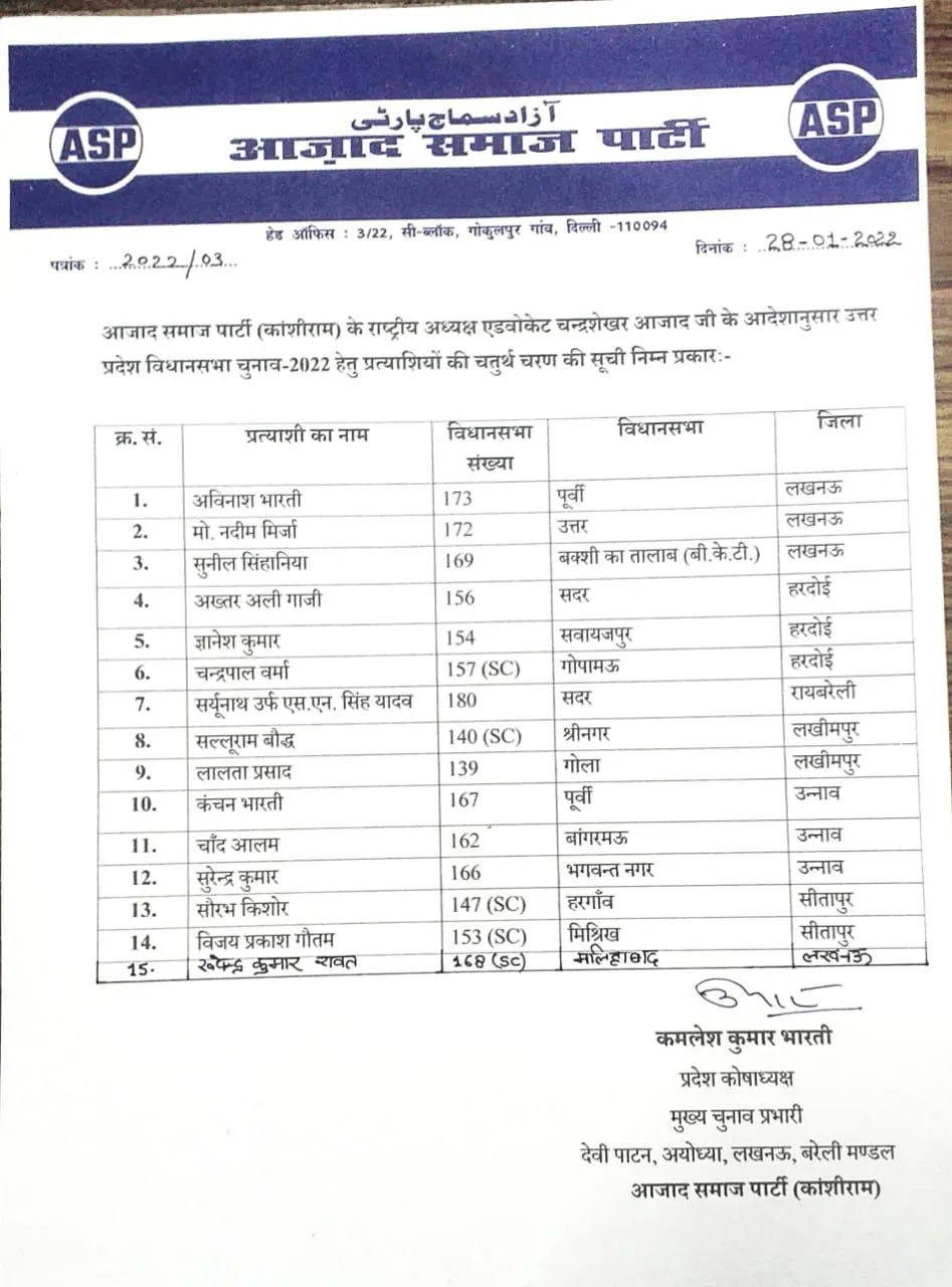 लखनऊ। आजाद समाज पार्टी ने यूपी विधानसभा चुनाव 2022 के लिए 15 और उम्मीदवारों की लिस्ट जारी की है। अविनाश भारती को पूर्वी लखनऊ से नदीम मिर्जा को उत्तर लखनऊ से, सुनील सिंघानिया को बीकेटी लखनऊ से, अख्तर अली गाजी को सदर हरदोई से ज्ञानेश कुमारक को सवायजपुर हरदोई से, चंद्र गोपाल वर्मा को गोपामऊ हरदोई से, एसएन सिंह यादव को सदर रायबरेली से, सल्लू रामबोद्ध को श्रीनगर लखीमपुर से, लालता प्रसाद को गोला लखीमपुर से, कंचन भारती को पूर्वी उन्नाव से, चांद आलम को बांगरमऊ उन्नाव से, सुरेंद्र कुमार को भगवंत नगर उन्नाव से, सौरभ किशोर को हरगांव सीतापुर से, विजय प्रकाश गौतम को मिश्रिख सीतापुर से और उपेंद्र कुमार रावत को मलिहाबाद लखनऊ से टिकट दिया गया है।