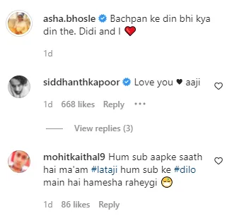 आशा भोसले की इस तस्वीर पर तमाम सेलेब्स कॉमेंट कर रहे हैं। रितिक रोशन ने कई हार्ट इमोजी बनाए हैं। सिद्धांत कपूर ने ‘लव यू आजी’ लिखा है। वहीं, तस्वीर पर फैंस खूब कॉमेंट कर रहे हैं और लता मंगेशकर को याद कर रहे हैं।