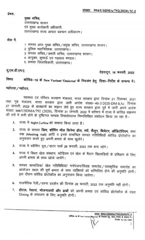 उत्तराखंड में हटाया गया नाइट कर्फ्यू, शासन से जारी हुए आदेश