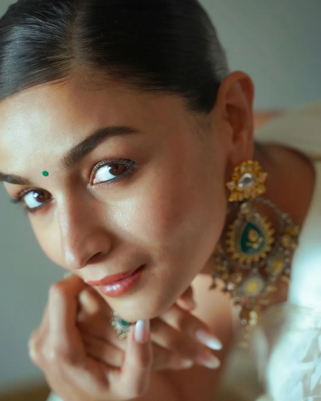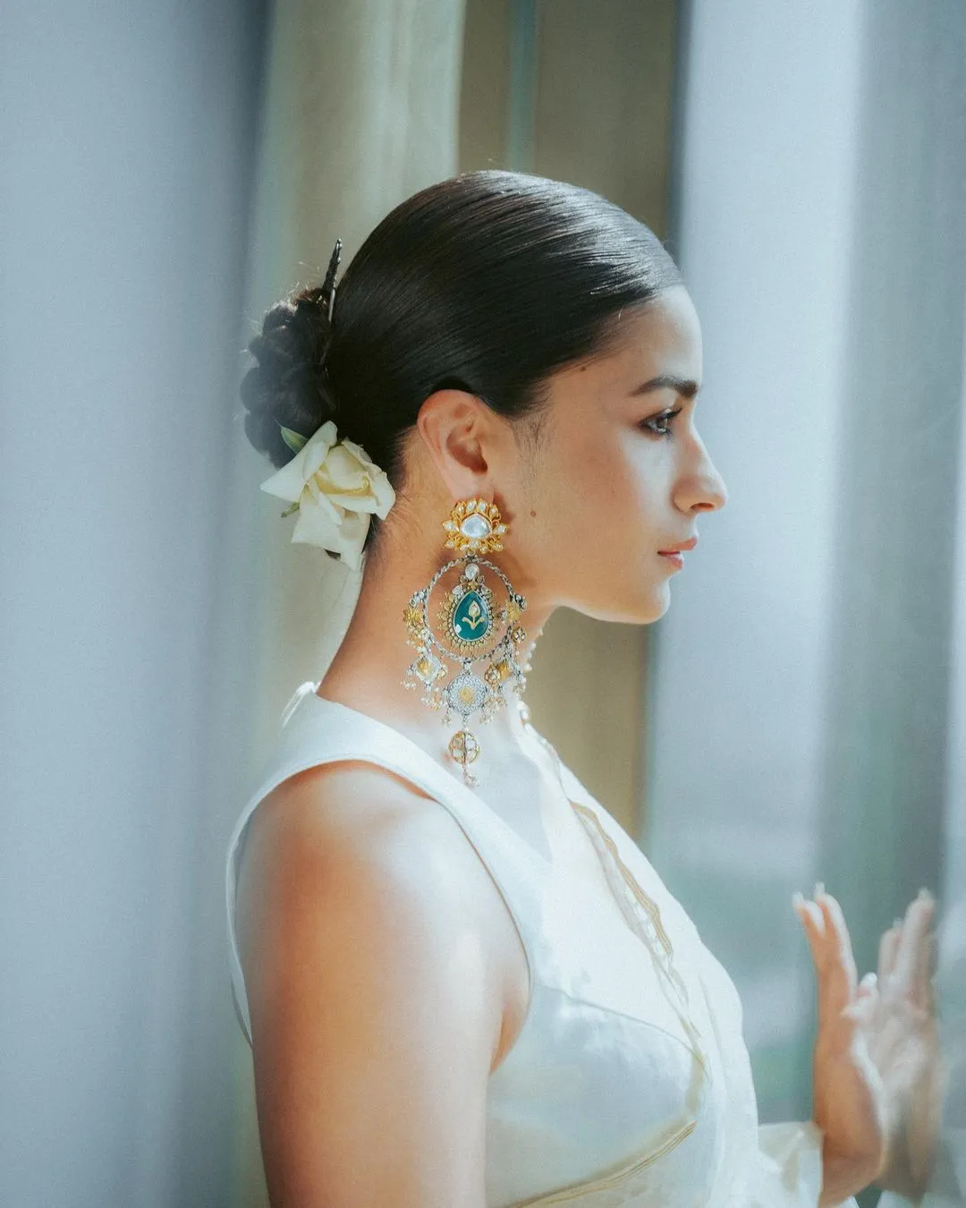 इन फोटोज में आलिया सफेद रंग की साड़ी पहने नजर आ रही हैं। इसके साथ ही उन्होंने इयररिंग्स और उसी के मैचिंग की अंगूठी भी पहन रखी है।