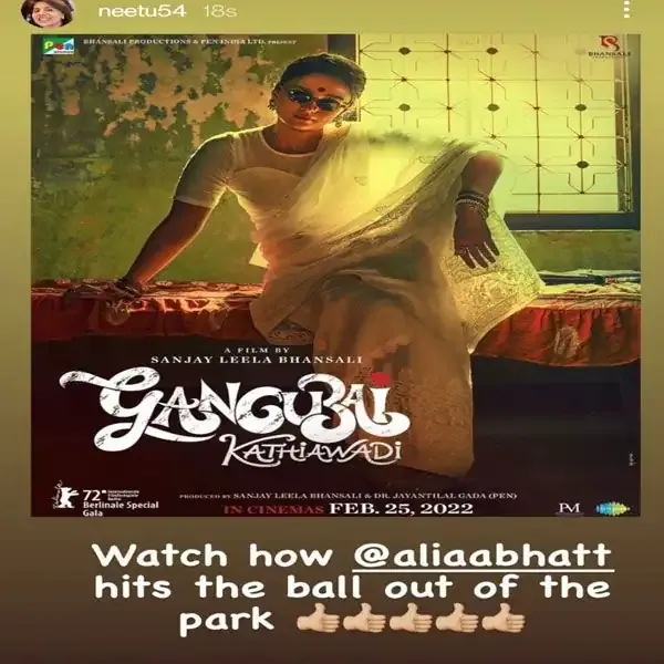 अपने इंस्टाग्राम हैंडल पर नीतू ने फिल्म में आलिया के काम की जमकर तारीफ की। नीतू कपूर ने अपनी इंस्टाग्राम स्टोरी में अलिया भट्ट स्टारर ‘गंगूबाई काठियावाड़ी’ के पोस्टर को साझा किया और लिखा, ‘देखो कि कैसे आलिया भट्ट ने कैसे बॉल को पार्क के बाहर हिट किया है।’ नीतू कपूर ने यह क्लियर कर दिया है कि आलिया भट्ट की परफॉर्मेंस से एक्ट्रेस काफी प्रभावित हुई हैं।
