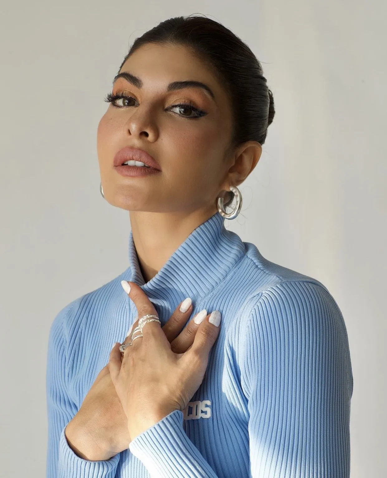 आप तस्वीरों में देख सकते हैं कि जैकलीन फर्नांडिस ने अपने बालों का बन बनाया है। कानों में ईयररिंग्स और स्मोकी मेकअप के साथ अपने लुक को कंप्लीट किया है।