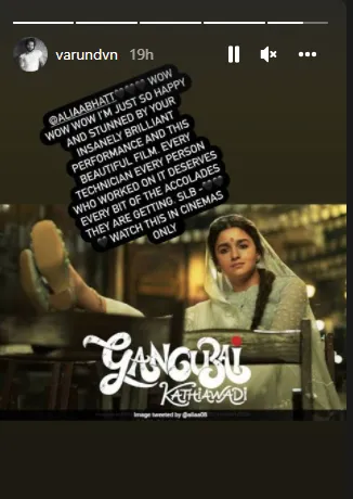 उन्होंने अपने इंस्टाग्राम स्टोरी पर गंगूबाई का पोस्टर शेयर कर लिखा, वाह वाह वाह, मैं आपके शानदार प्रदर्शन और इस खूबसूरत फिल्म से बहुत खुशी और आश्चर्यचकित हूं। हर टेक्नीशियन, हर व्यक्ति जिसने इस फिल्म में काम किया है। वे सभी प्रशांसा के पात्र हैं। इस फिल्म को केवल सिनेमाघरों में ही देखें।