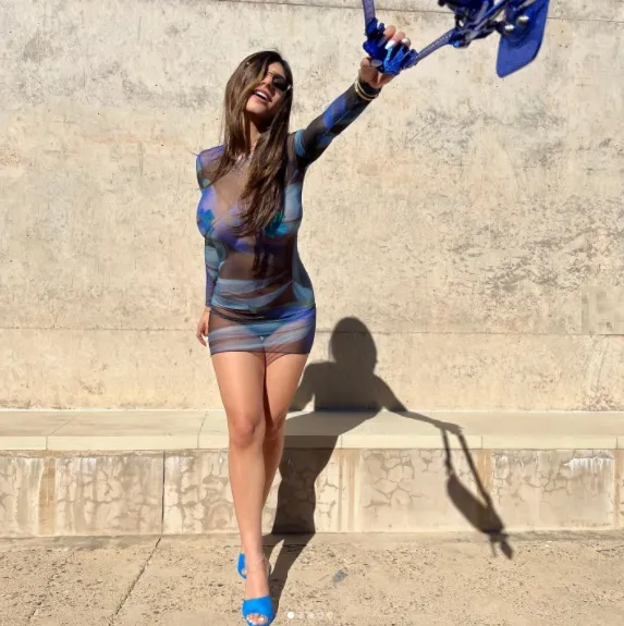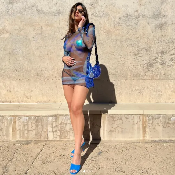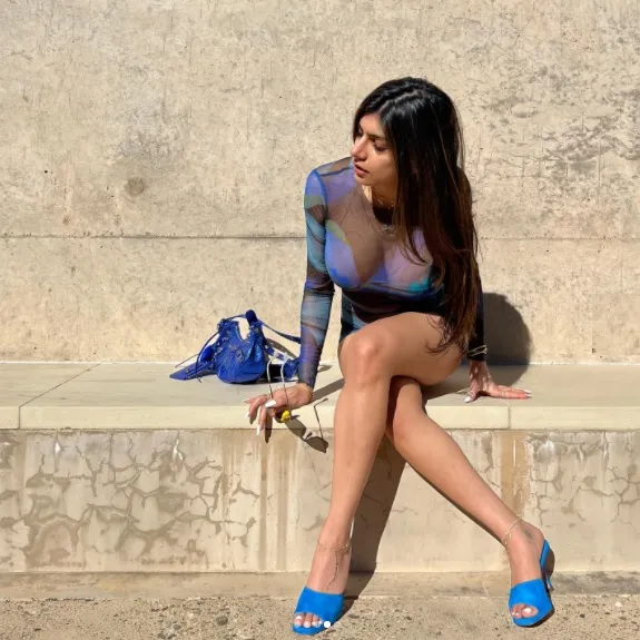 तस्वीरों में मिया खलीफा एक श‍ियर ब्लू ड्रेस पहनी नजर आ रही हैं, जिसके साथ उन्होंने ब्लू हील्स और मैच‍िंग हैंडबैग कैरी किया है।