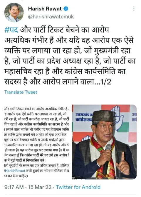 उन्होंने ट्विटर पर लिखा, पद और पार्टी टिकट बेचने का आरोप अत्यधिक गंभीर है और यदि यह आरोप एक ऐसे व्यक्ति पर लगाया जा रहा हो, जो मुख्यमंत्री रहा है, जो पार्टी का प्रदेश अध्यक्ष रहा है, जो पार्टी का महासचिव रहा है और कांग्रेस कार्यसमिति का सदस्य है और आरोप लगाने वाला व्यक्ति भी गंभीर पद पर विद्यमान व्यक्ति हो… तो यह आरोप और भी गंभीर हो जाता है। यह आरोप मुझ पर लगाया गया है। मैं भगवान से प्रार्थना करता हूं कि कांग्रेस पार्टी इस आरोप के आलोक में मुझे पार्टी से निष्कासित कर दे।