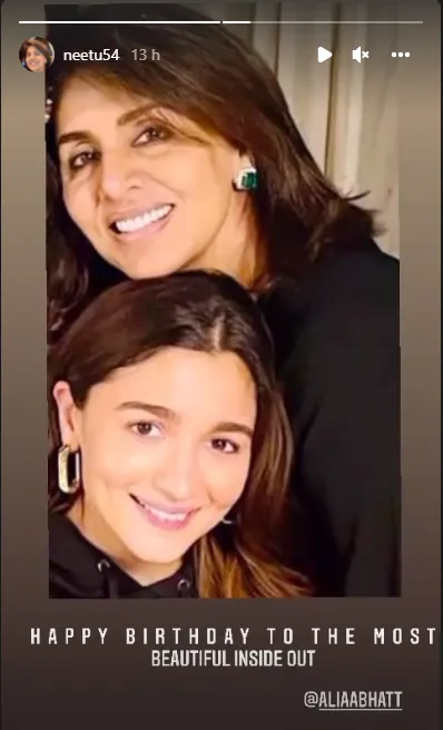 आलिया भट्ट इस समय अपनी बहन शाहीन के साथ वेकेशन एंजॉय कर रही हैं। आलिया के बर्थडे पर नीतू कपूर ने अपनी इंस्टाग्राम स्टोरी पर एक फोटो शेयर की है। जिसमें दोनों ही ब्लैक आउटफिट में नजर आ रही हैं। नीतू सिंह ने फोटो शेयर करते हुए लिखा- बाहर और अंदर से सबसे खूबसूरत को हैप्पी बर्थडे।