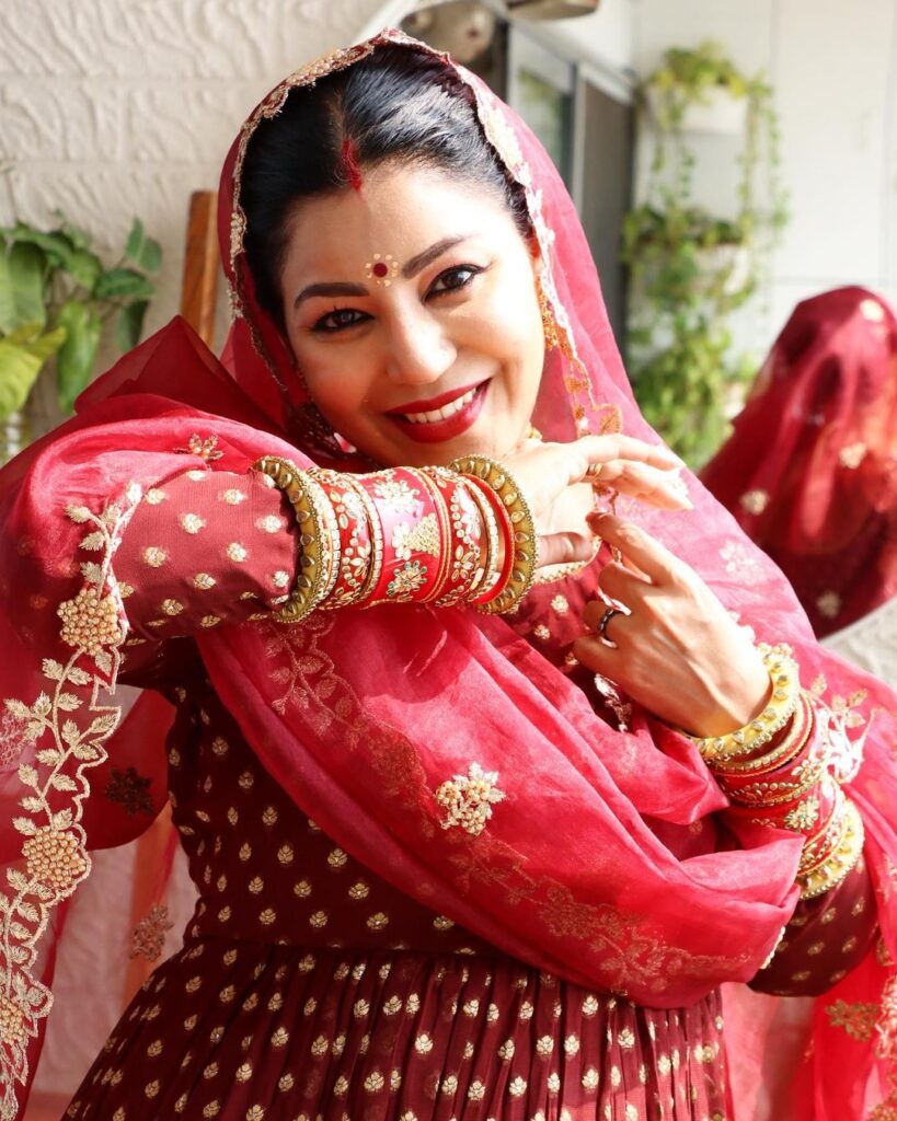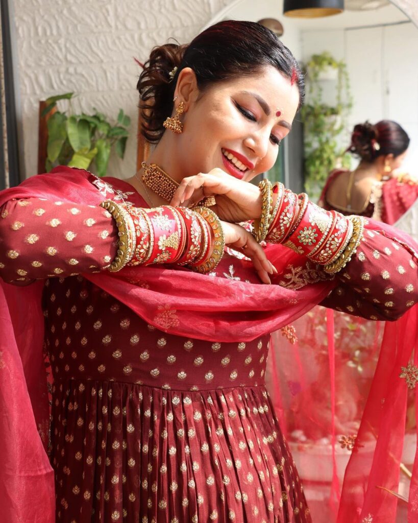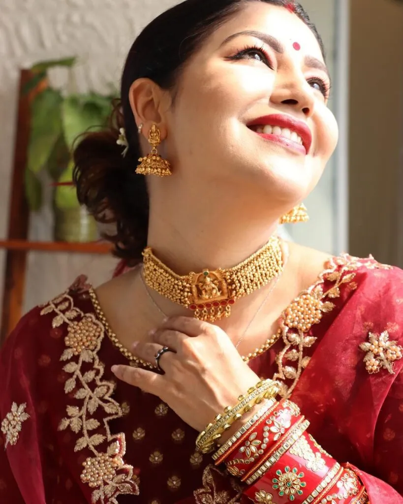 देबीना के ट्रेडिशनल जूलरी, बिंदी, सिंदूर, चूड़े , रेड लिपस्टिक, विंग आईलाइनर के साथ लाइट मेकअप किया है।