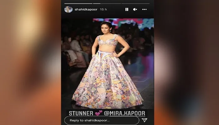 मीरा ने ढेरों फोटोज और वीडियो इंस्टाग्राम पर शेयर किया है। फैंस के अलावा उनके पति शाहिद कपूर ने भी उन्हें चीयर किया। शाहिद कपूर ने मीरा की प्यारी-सी फोटो को शेयर कर उनकी तारीफ की। शाहिद ने रैंप वॉक करते हुए मीरा के एक फोटो को शेयर किया है. इसके साथ उन्होंने कैप्शन में लिखा, ‘स्टनर’।