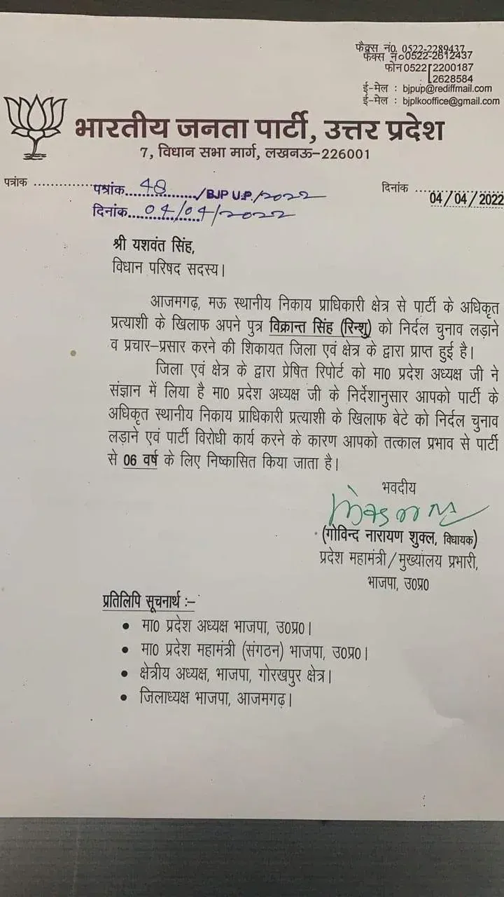 बता दें कि यूपी विधान परिषद चुनाव में आजमगढ़-मऊ सीट से भाजपा ने अपने पूर्व विधायक अरुणकांत यादव को मैदान में उतारा है। वहीं, पार्टी के एमएलसी यशवंत सिंह के बेटे विक्रांत सिंह भी बागी होकर मैदान में कूद गए हैं। इसके बाद भाजपा प्रदेश अध्यक्ष स्वतंत्र देव सिंह के निर्देश पर सिंह के खिलाफ निष्कासन की कार्रवाई की गयी है। अरुणकांत यादव सपा विधायक और बाहुबली रमाकांत यादव के बेटे हैं।