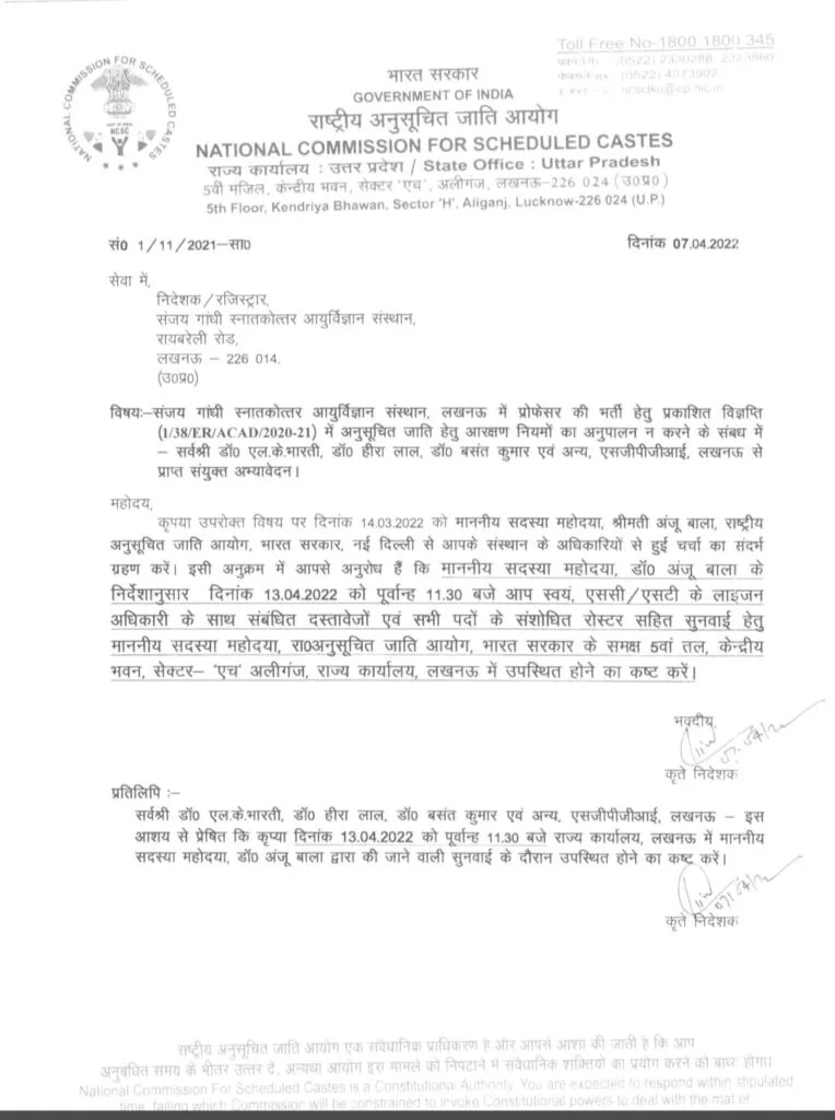 लखनऊ। एसजीपीजीआई लखनऊ में लम्बे समय से आरक्षण के नियमों के उल्लंघन के मामले को निस्तारित करने के लिए राष्ट्रीय अनुसूचित जाति आयोग ने एसजीपीजीआई के निदेशक को 13 अप्रैल आयोग में तलब किया है। एसजीपीजीआई में अनुसूचित जाति, जनजाति और पिछड़ा वर्ग के डॉक्टरों की आपत्ति थी कि पिछले कई वर्षों से यहां नियुक्तियों के लिए जो भी विज्ञापन निकाले जा रहे हैं, उनमें आरक्षण के नियमों का पालन नहीं हो रहा है और भर्ती प्रक्रिया में राज्य सरकार द्वारा बनाये गए रोस्टर का पालन नहीं किया जा रहा है।