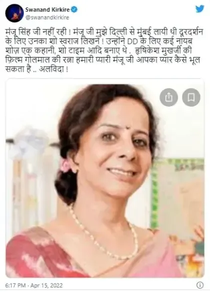 स्वानंद किरकिरे ने लिखा कि ‘मंजू सिंह जी नहीं रही! मंजू जी मुझे दिल्ली से मुंबई लायी थीं दूरदर्शन के लिए उनका शो स्वराज लिखने! उन्होंने DD के लिए कई नायाब शोज एक कहानी, शो टाइम आदि बनाए थे। हृषिकेश मुखर्जी की फिल्म गोलमाल की ‘रत्ना’ हमारी प्यारी मंजू जी आपका प्यार कैसे भूल सकता है… अलविदा!’