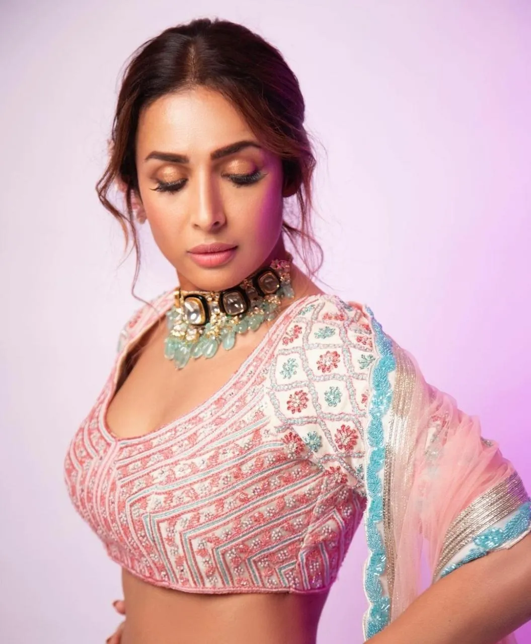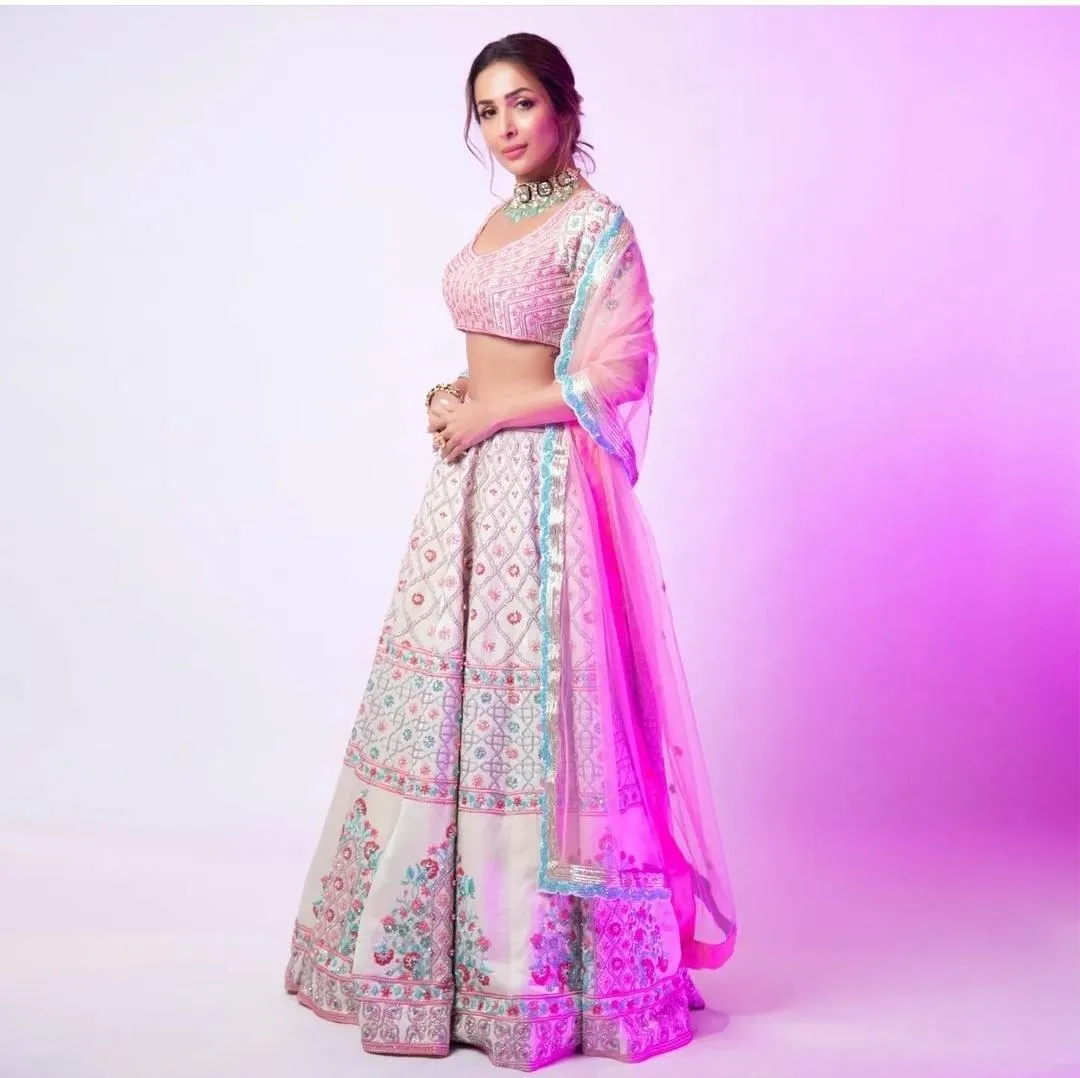 मलाइका अरोड़ा के लुक की बात करें तो उन्होंने पिंक और स्काई ब्लू के कॉम्बिनेशन में लहंगा पहना हैं। इसके साथ ही उन्होंने हेवी नेकपीस कैरी किया है।