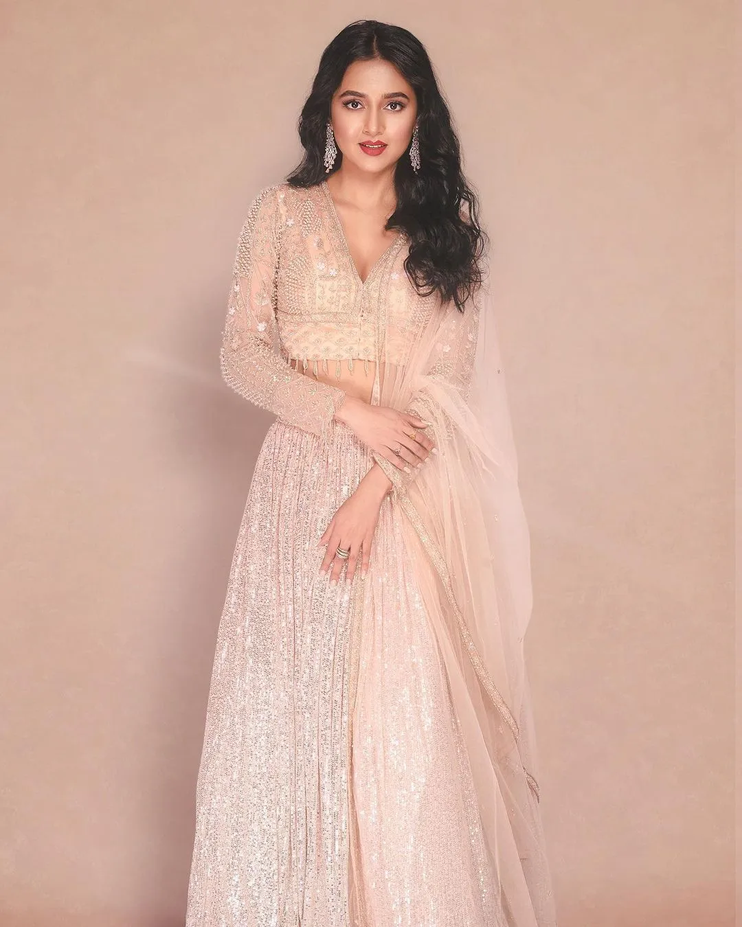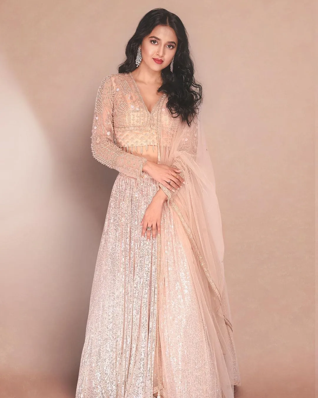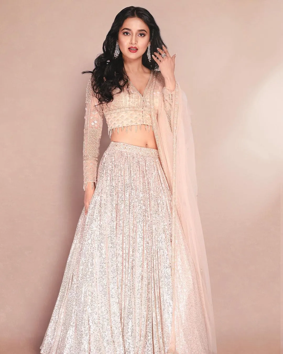 टीवी एक्ट्रेस तेजस्वी प्रकाश ने पीच कलर का लहंगा और चोली पहना है, जिसमें वह बेहद खूबसूरत लग रही हैं। उन्होंने अपने लुक को कम्प्लीट करने के लिए बालों को खुला रखा है और कानों में झुमके पहने हैं।