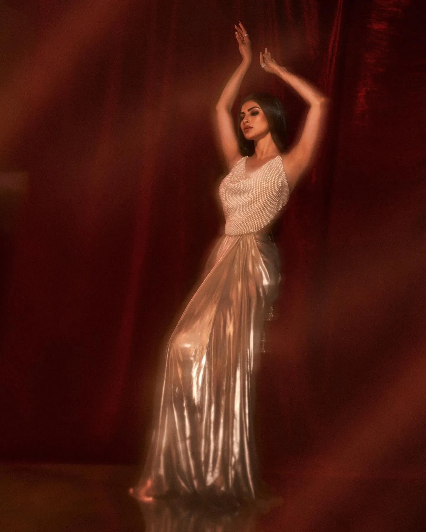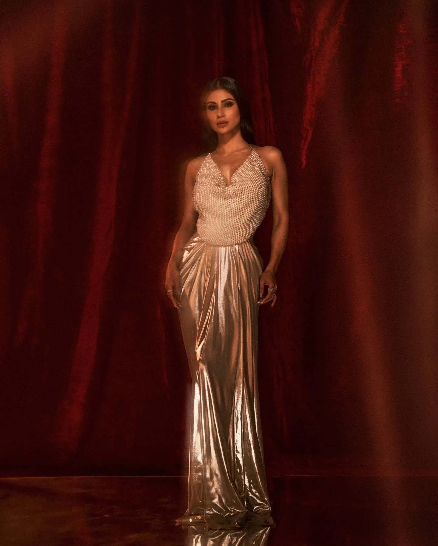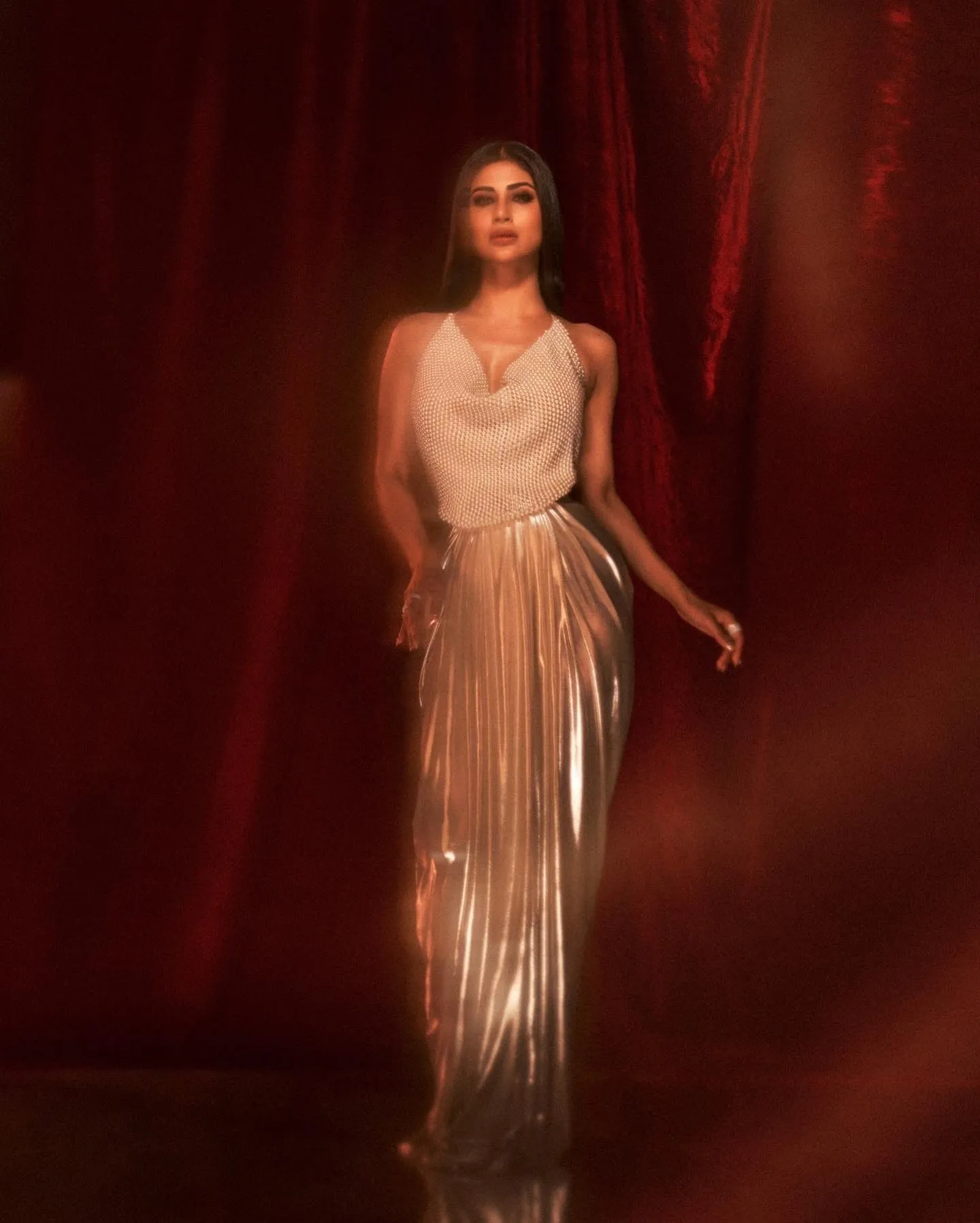 इन तस्वीरों में मौनी रॉय स्टाइलिश बैकलेस पर्ल टॉप और मैटेलिक प्लीटेड स्कर्ट सेट में हुस्न का जलवा बिखेरती नजर आ रही हैं।