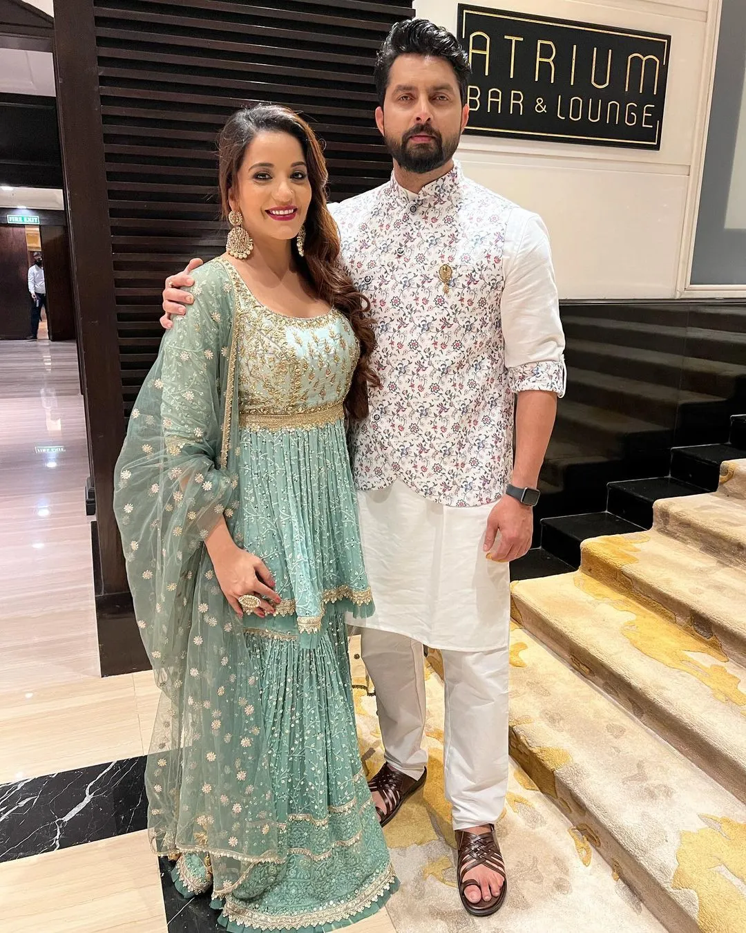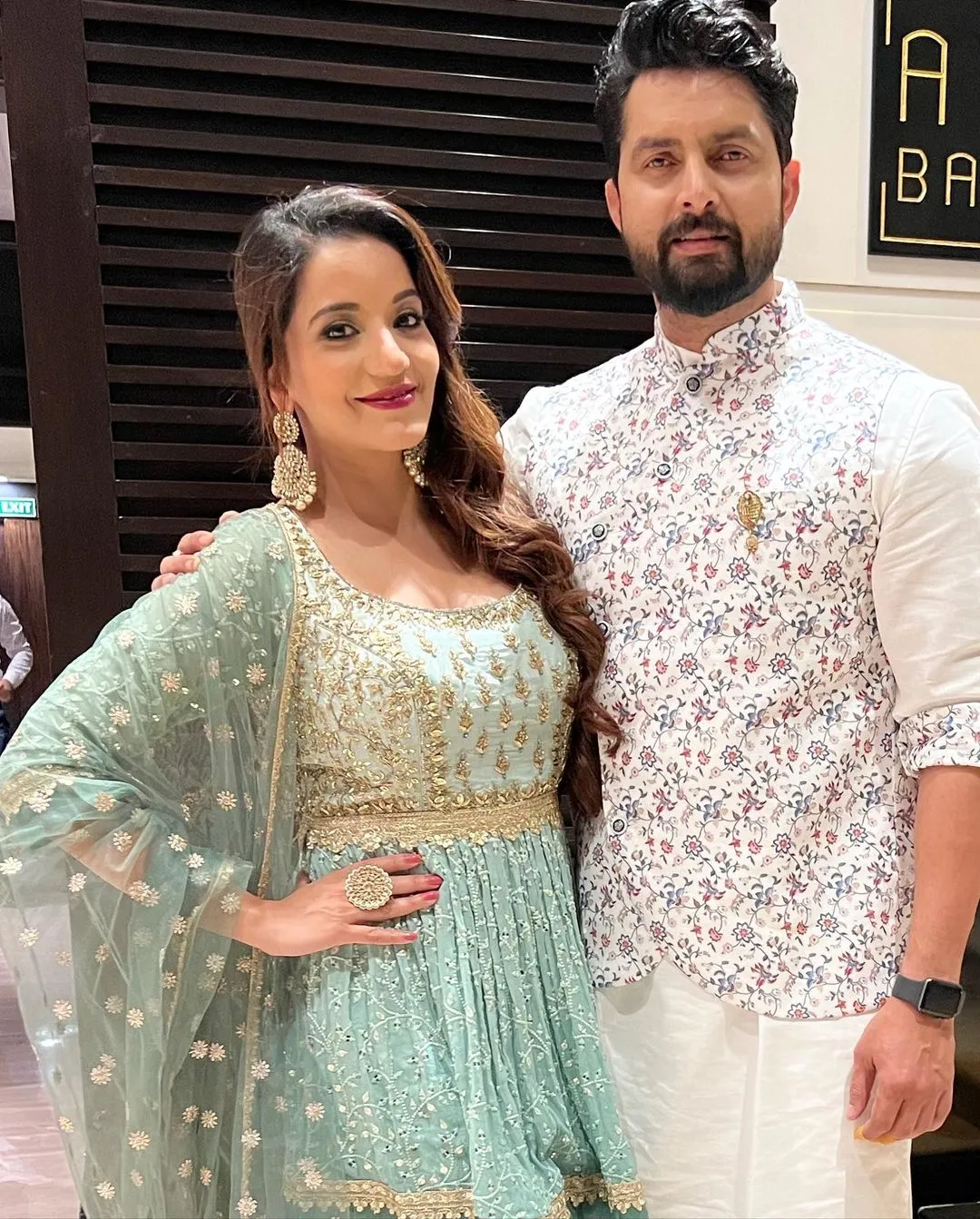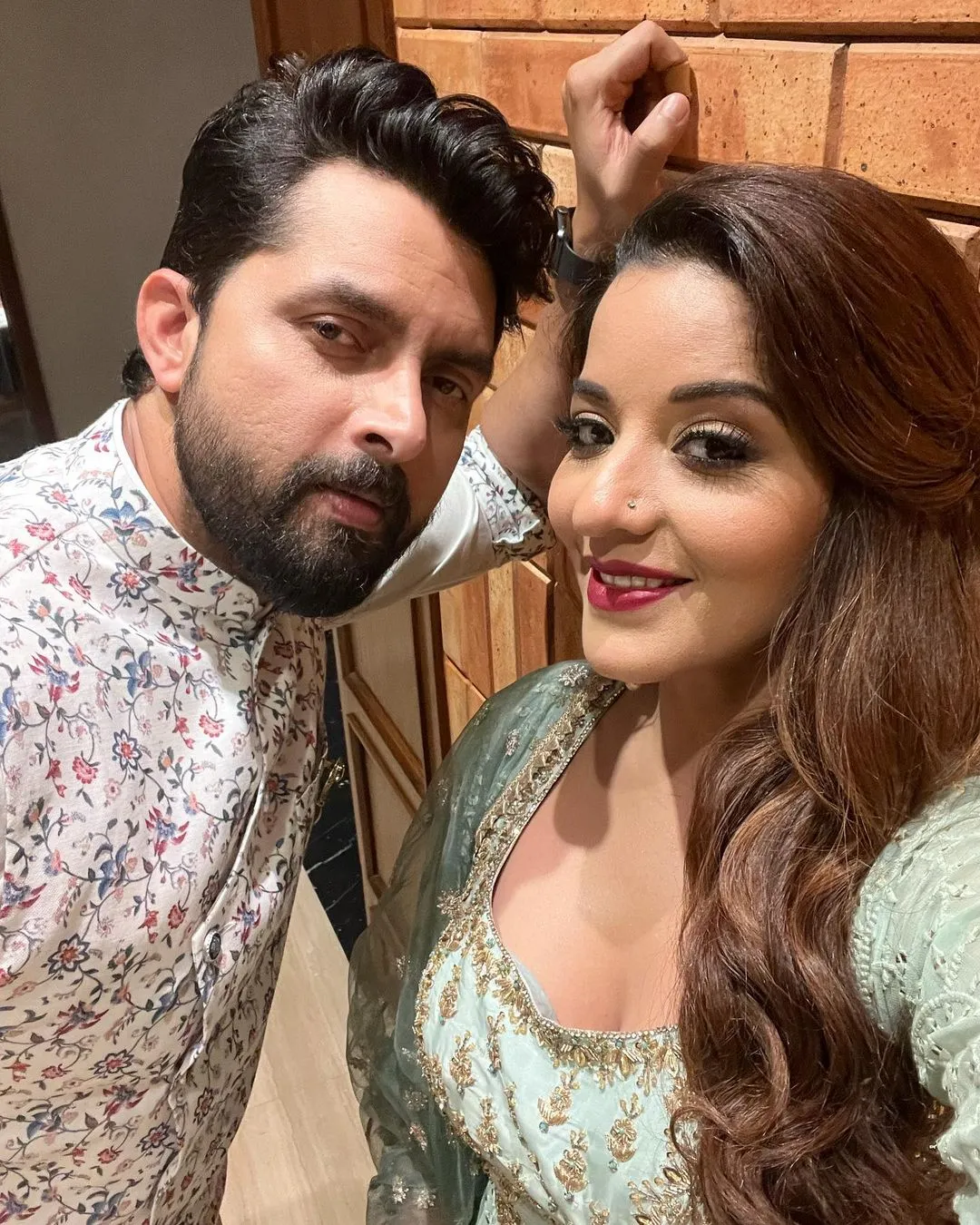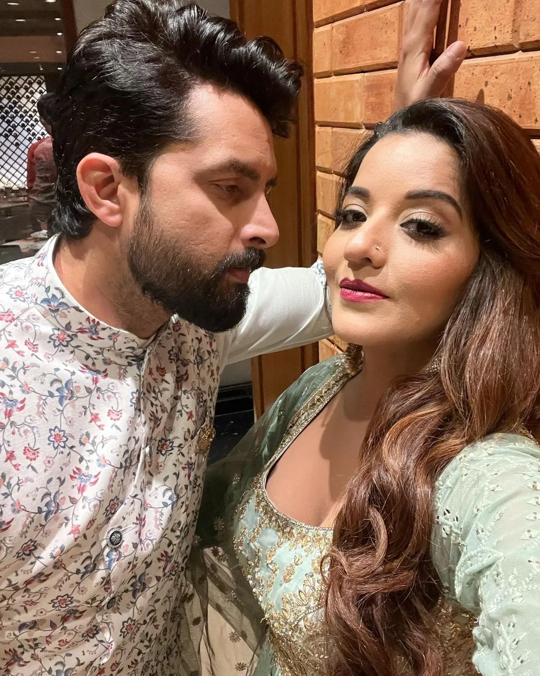 Monalisa-Vikrant Photos: शरारा में बला की खूबसूरत लग रहीं भोजपुरी एक्ट्रेस, पति के साथ दिए रोमांटिक पोज