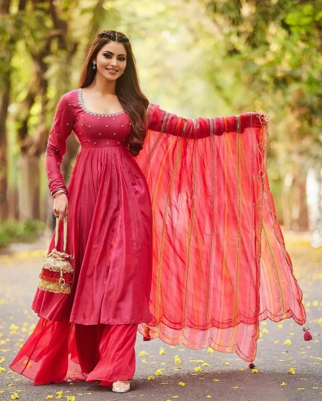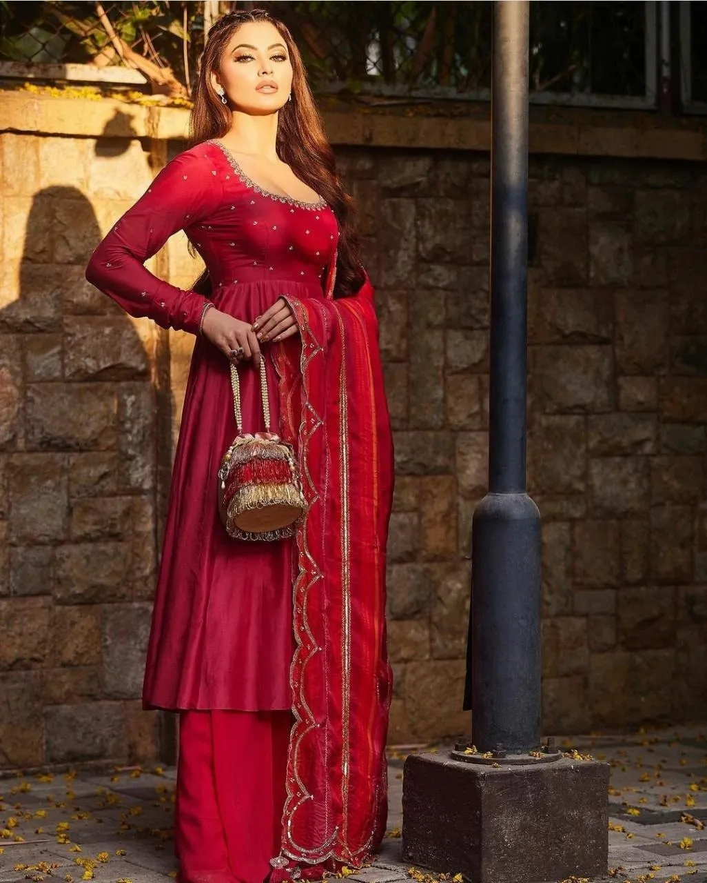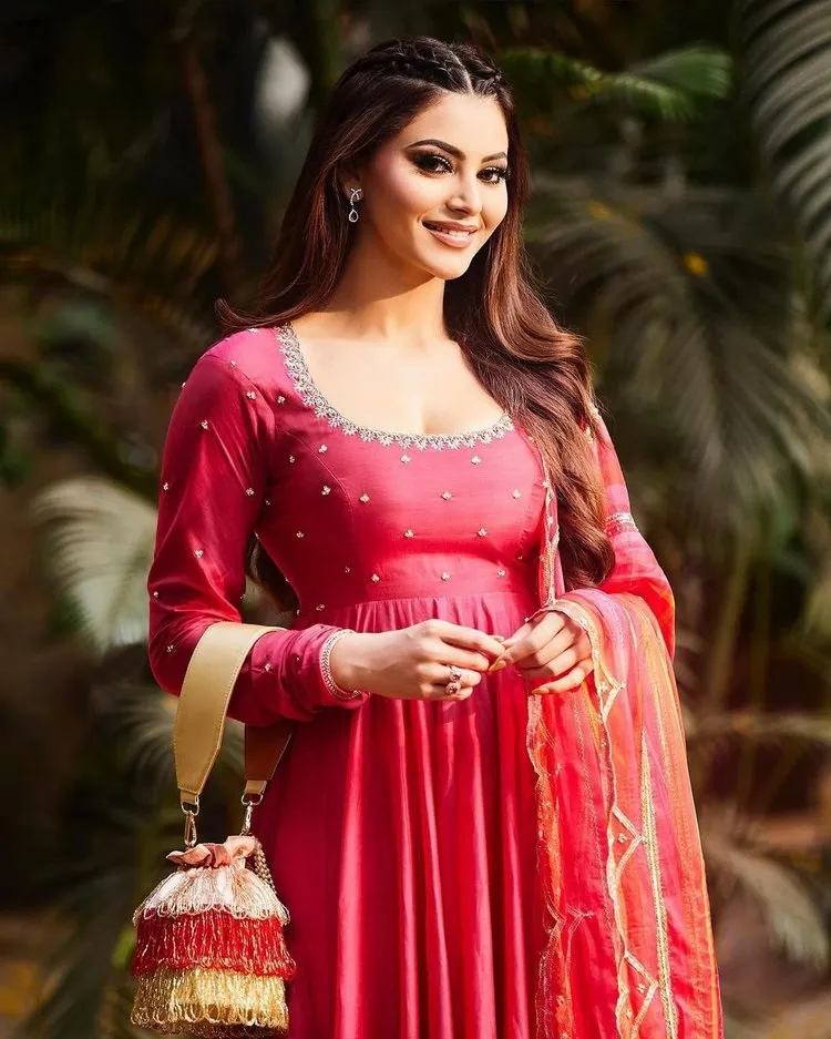 इन तस्वीरों में अदाकारा ने पिंक कलर का फ्रॉक सूट और प्लाजो सेट पहना है, जिसके साथ उन्होंने मैचिंग दुपट्टा भी कैरी किया है। इस ट्रेडिशनल लुक के साथ उर्वशी ने एक हैंगिग बैग भी ले रखा है, जो उनके लुक पर चार चांद लगा रहा है।