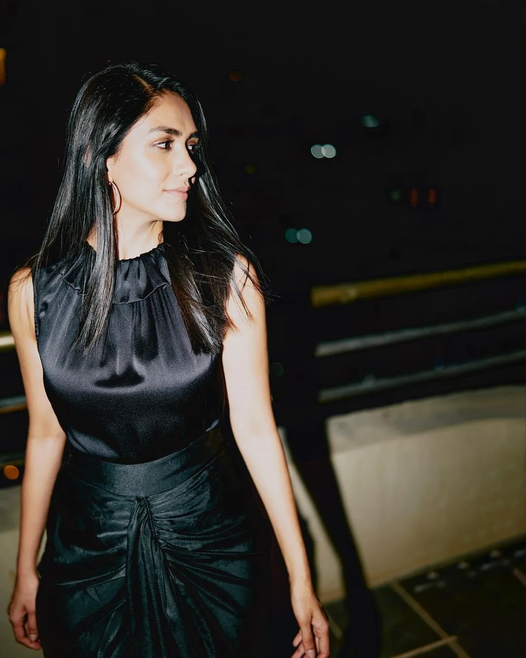 ब्लैक सिल्क हाई-वेस्ट लॉन्ग स्कर्ट में मृणाल के साथ स्लीवलेस ब्लैक सैटिन टॉप पेयर किया, जिसमें वो बेहद गॉर्जियस नजर आ रहीं हैं।