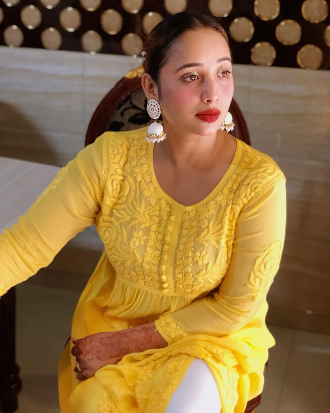 ईद के मौके पर रानी चटर्जी एक बार फिर देसी अवतार में नजर आई हैं। जिसमें वो बेहद प्यारी नजर आ रही हैं। तस्वीरों में रानी चिकनकारी येलो कुर्ती पहने नजर आ रही हैं। हाथों में मेहंदी और कानों में बड़े झूमकों वाला रानी का ये लुक फैन्स को काफी पसंद आ रहा है।
