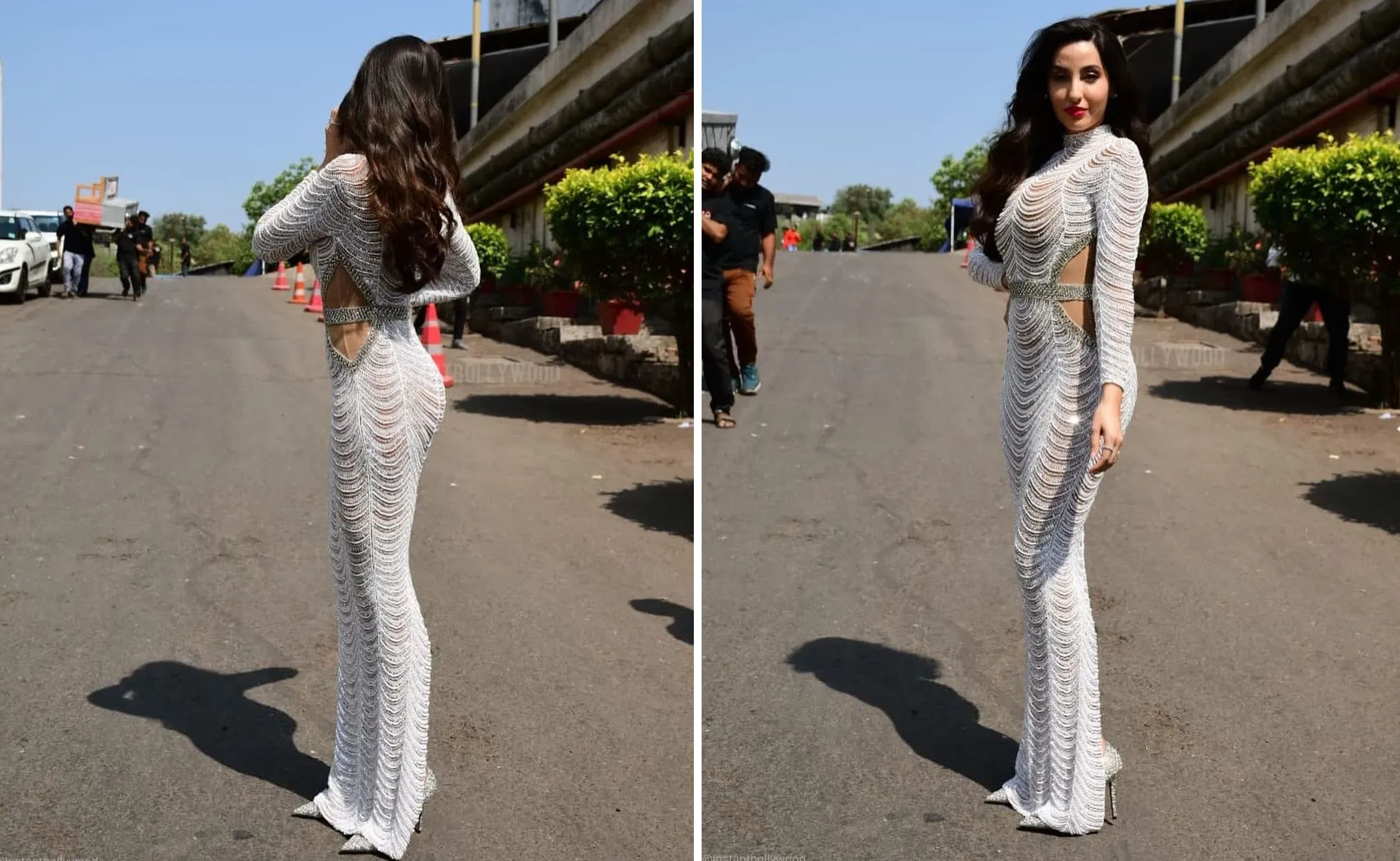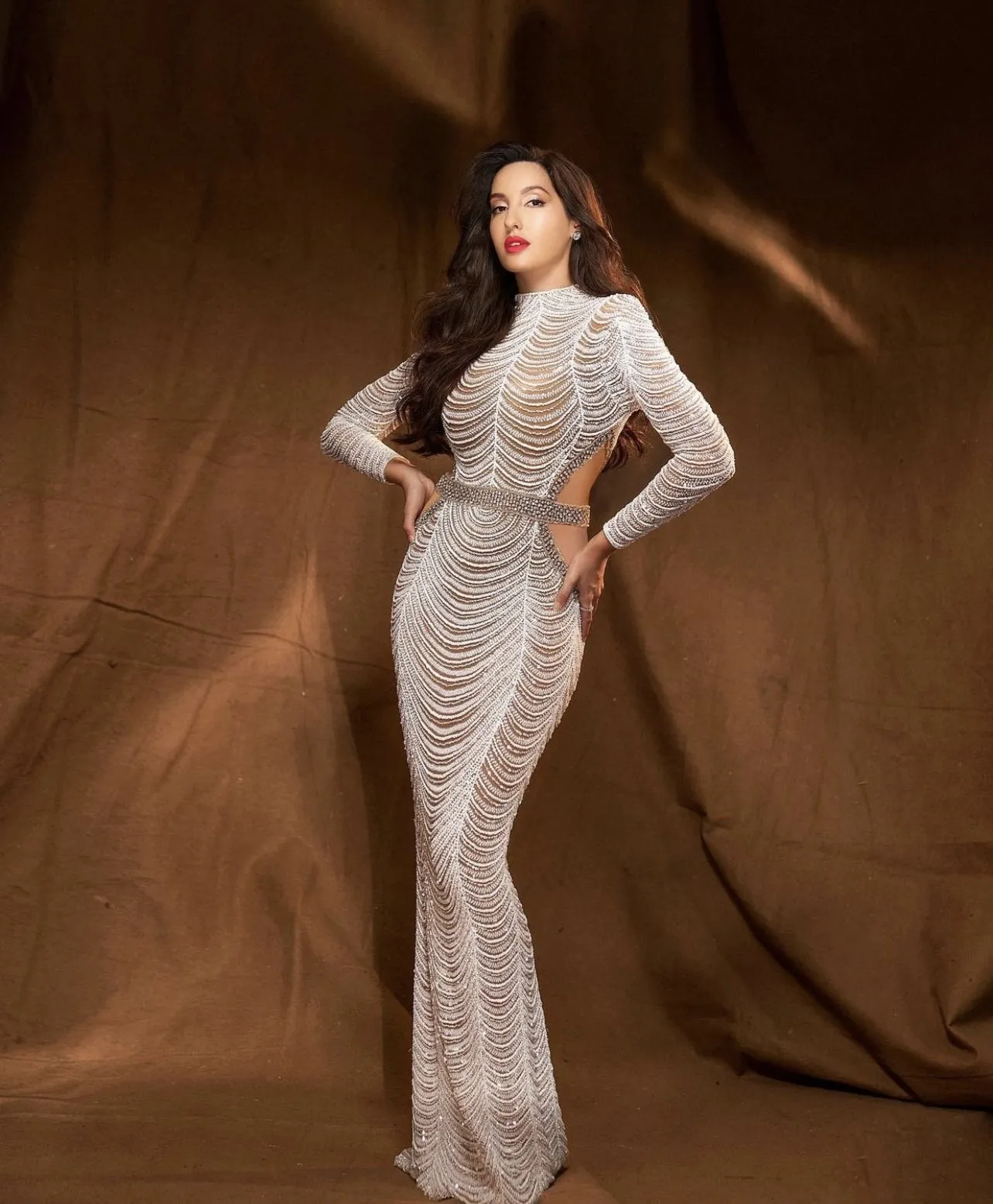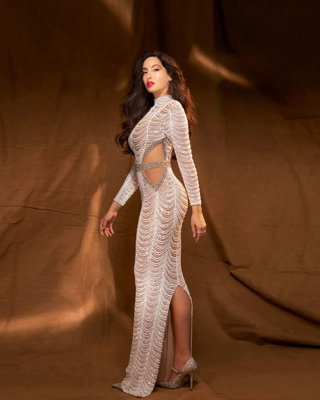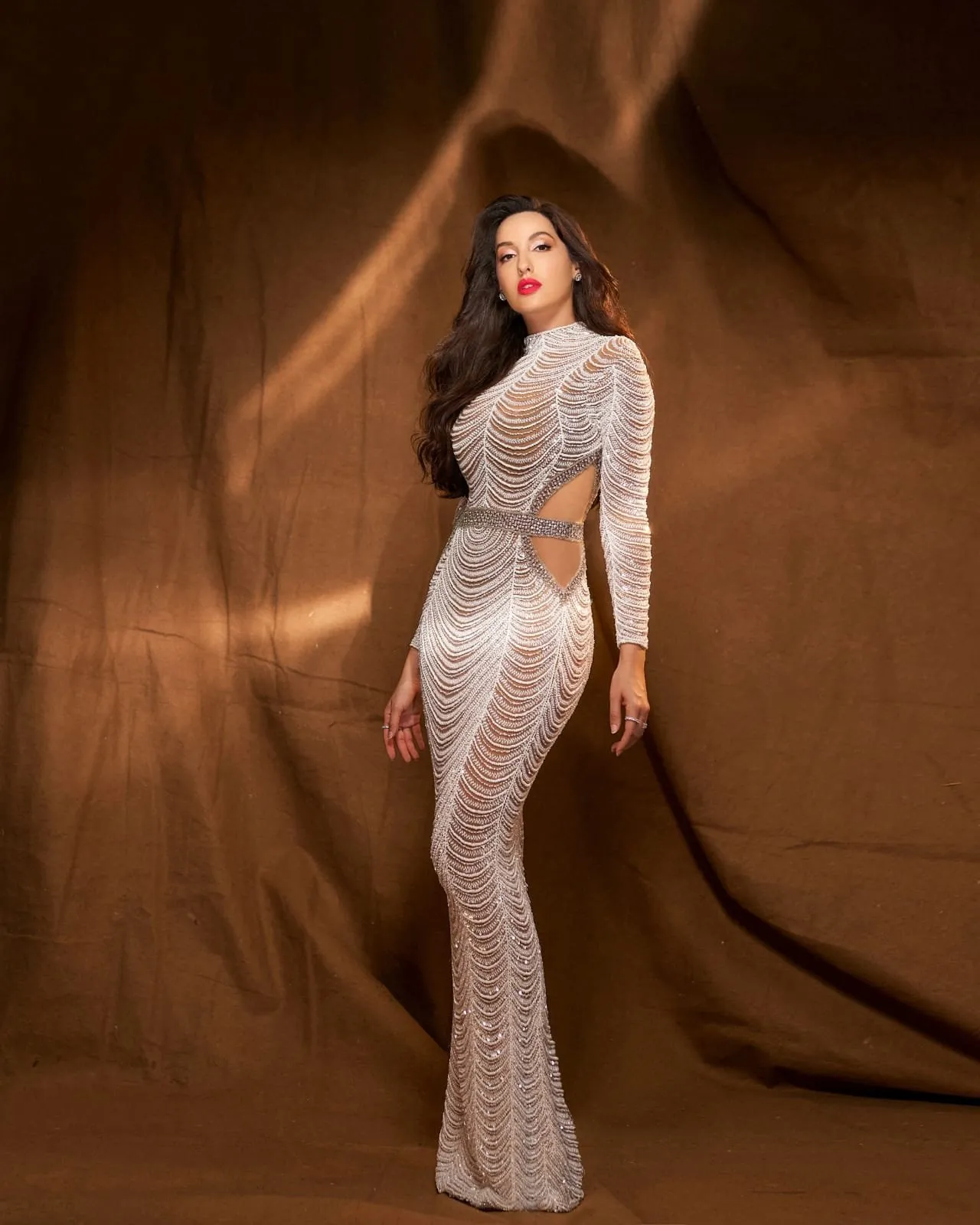 इन तस्वीरों में नोरा सिल्वर गाउन पहने अपने हुस्न का जलवा बिखेरती नजर आईं हैं। उन्होंने रेड लिपस्टिक, आई शैडो और फाउंडेशन लगाया है। नोरा ने हाई हील्स को पहनकर अपने लुक को पूरा किया, जो उनके पहनावे के लिए एक बढ़िया चॉइस है।