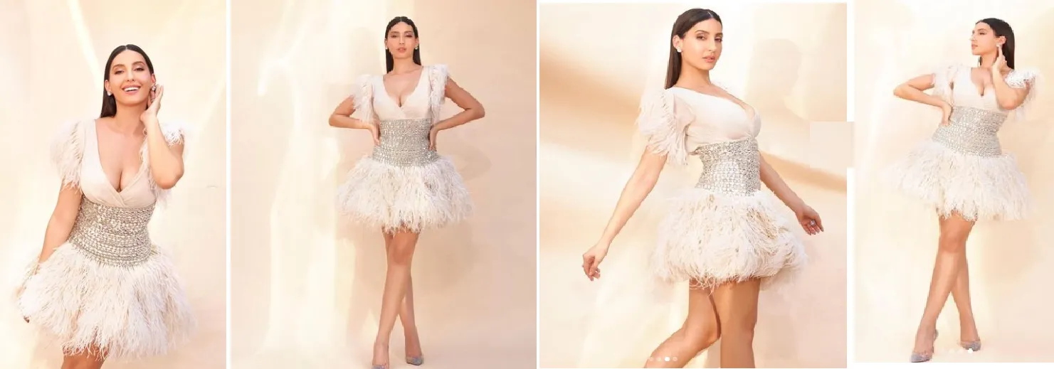 इन तस्वीरों में एक्ट्रेस की लुक की बात करें तो नोरा ने व्हाइट कलर की शॉर्ट ड्रेस को न्यूड मेकअप के साथ पूरा किया है। वेस्टर्न ऑउटफिट के साथ लाइट वेट एयरिंग्स और स्ट्रेट हेयर में एक्ट्रेस बेहद खूबसूरत लग रही हैं।