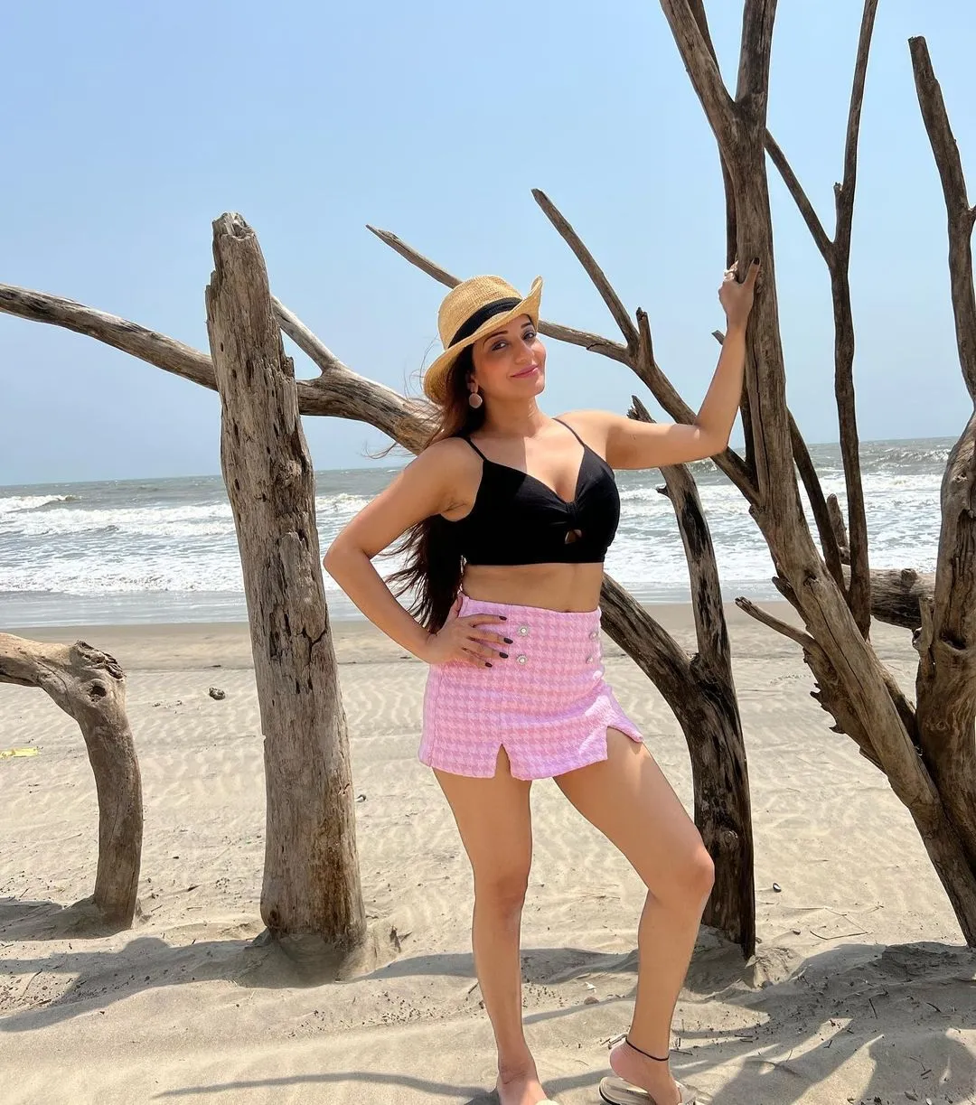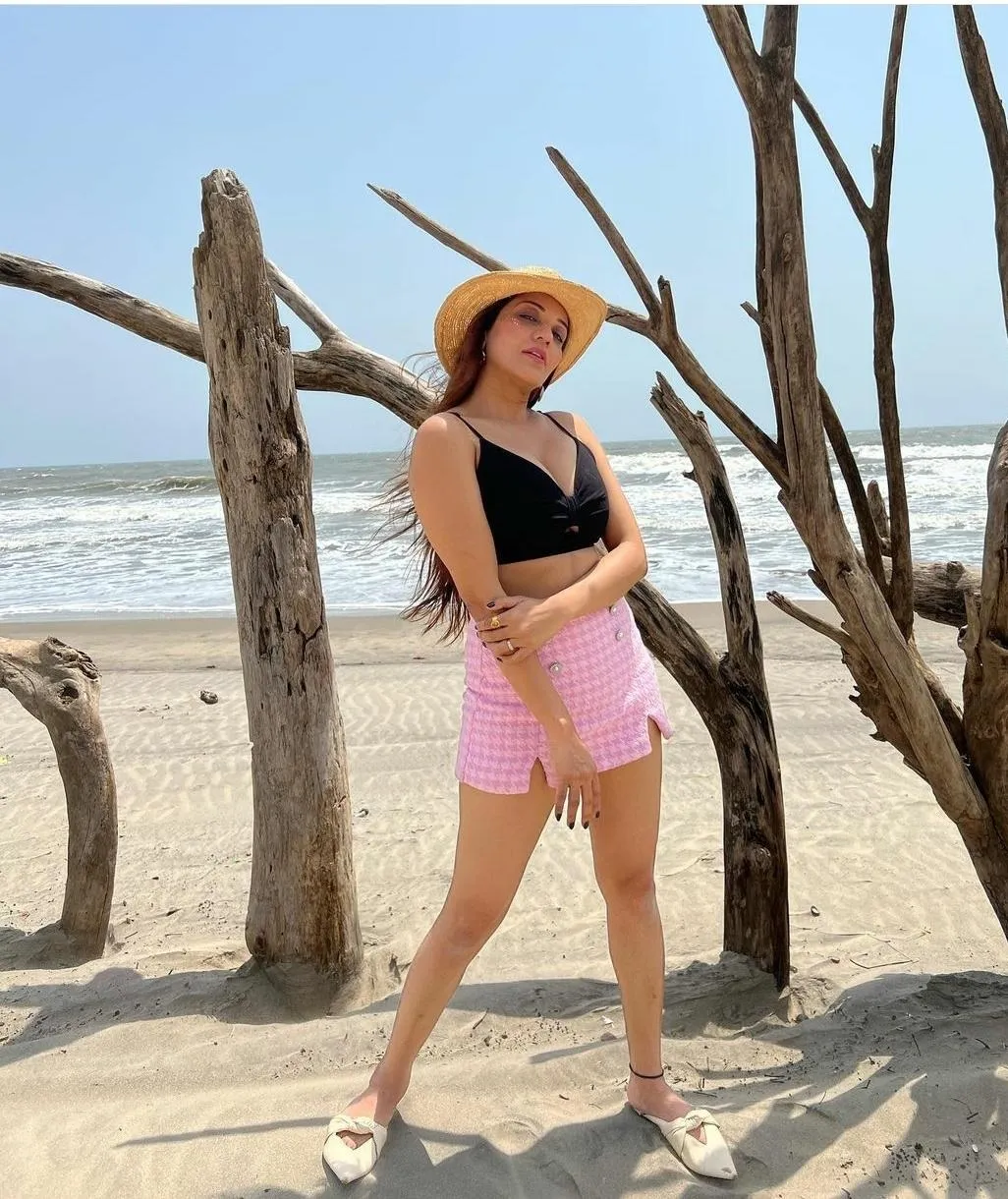 एक्ट्रेस ने ब्लैक कलर की ब्रालेट और पिंक चेक वाली शॉर्ट स्कर्ट कैरी की है। इसके साथ और हैट भी पहनी हुई है। मोनालिसा की मिलियन डॉलर स्माइल उनके लुक में चार चांद लगा रही हैं।