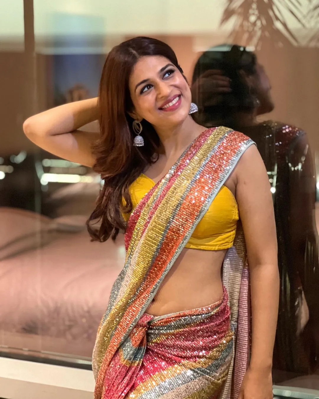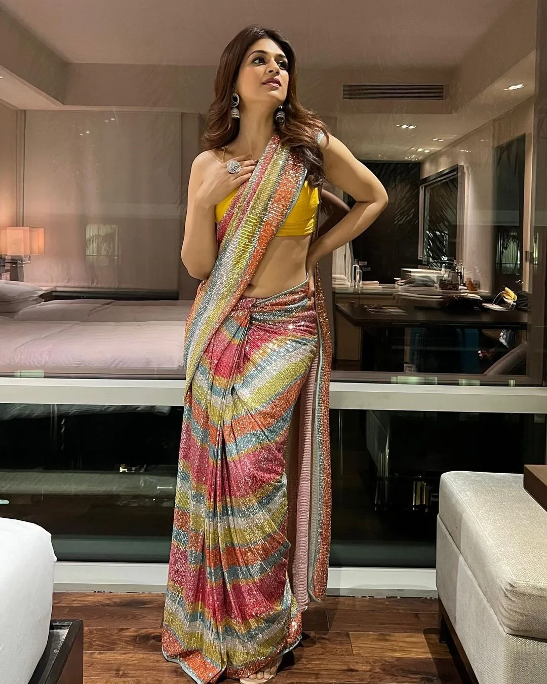फोटो में उन्हें स्लीवलेस यलो कलर के ब्लाउज के साथ सतरंगी साड़ी में देखा जा सकता है। उनकी साड़ी में चमकीली मोतियों का काम किया गया है, जिसकी चमक एक्ट्रेस को साइनिंग को बढ़ा रही है।